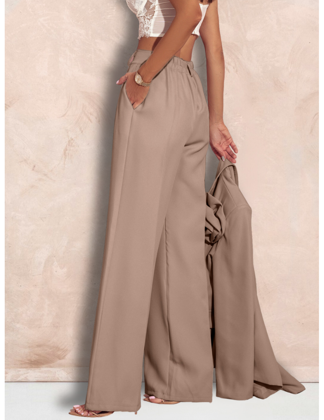 Szerokie spodnie z eleganckim kantem idealnie komponują się z dynamiczną sylwetką, a wszyta z tyłu guma w pasie gwarantuje komfort przez cały dzień.