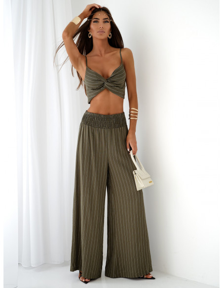 Lniany komplet crop top i szerokie spodnie SETI - khaki