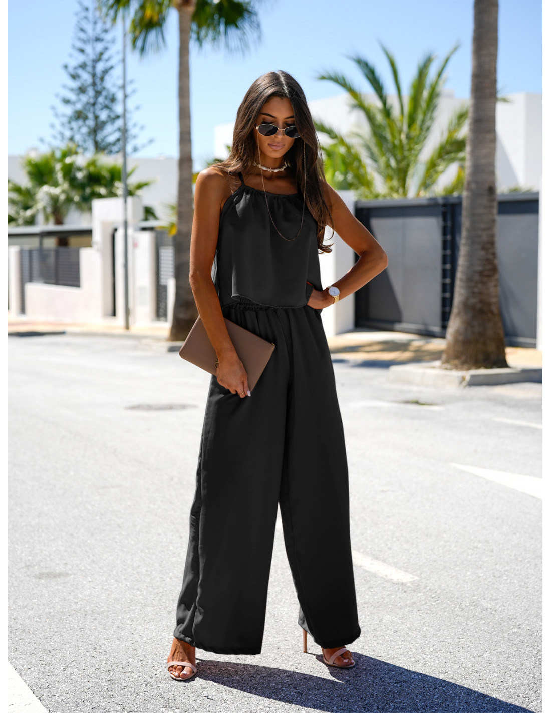 Składa się z oversizowego topu na cienkich ramiączkach, który delikatnie opływa sylwetkę, oraz szerokich spodni z gumą w pasie, zapewniających pełen komfort noszenia przez cały dzień.