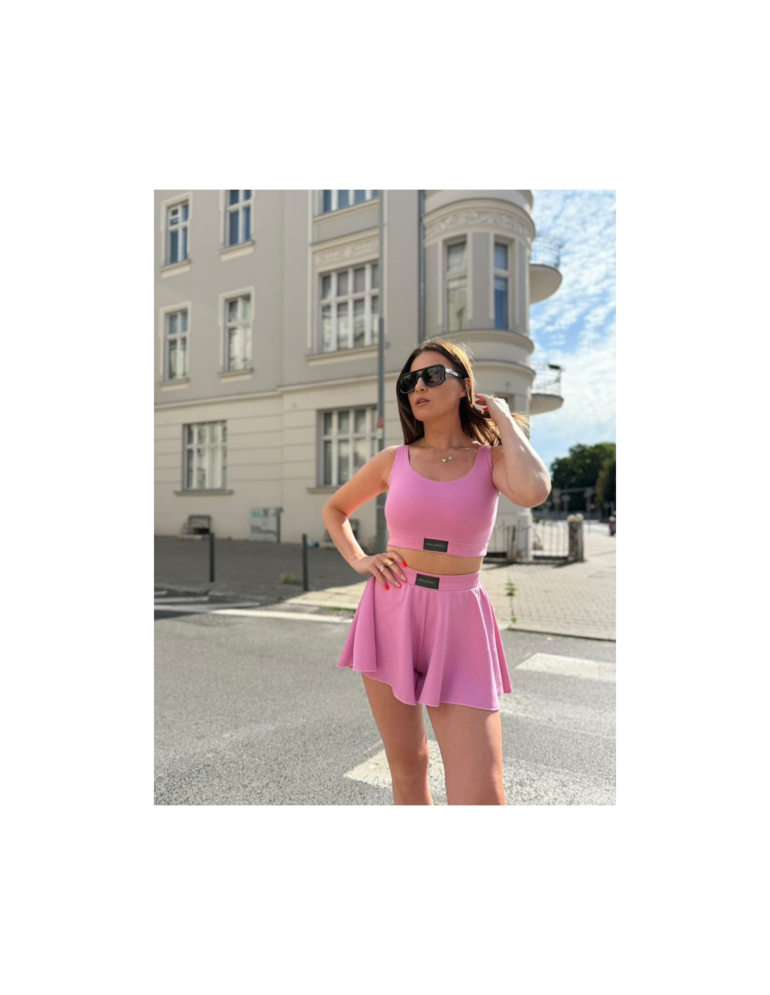 Krótki top na ramiączkach z elastyczną gumką pod biustem pięknie eksponuje sylwetkę, a rozkloszowane szorty z gumką w pasie nadają stylizacji lekkości i swobody.
