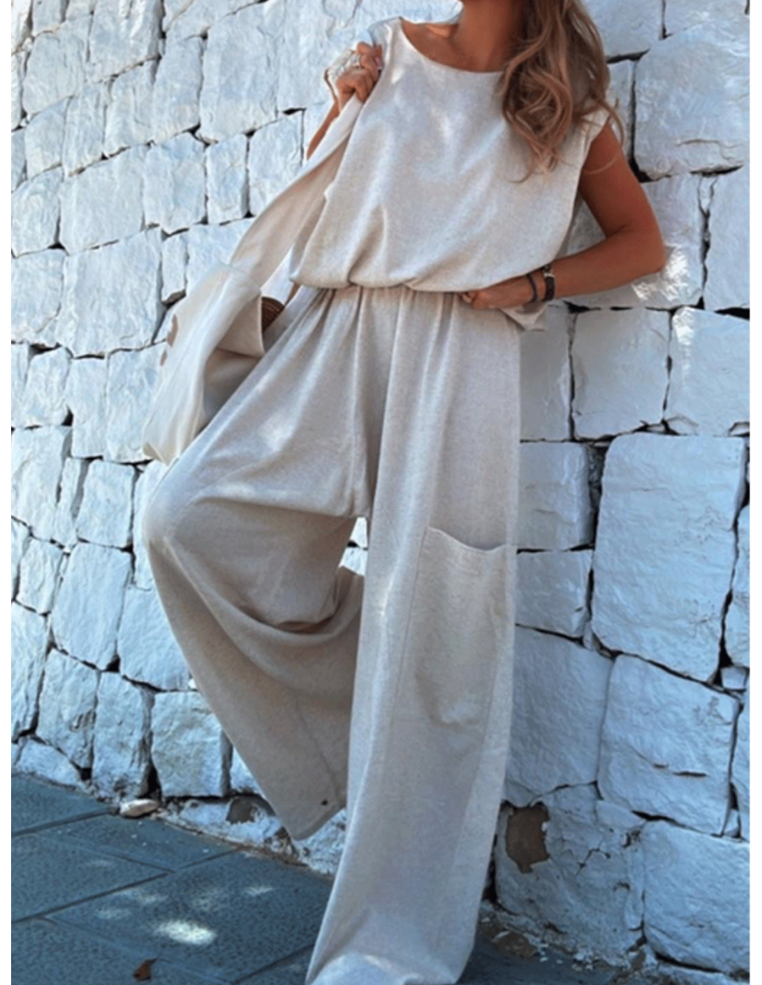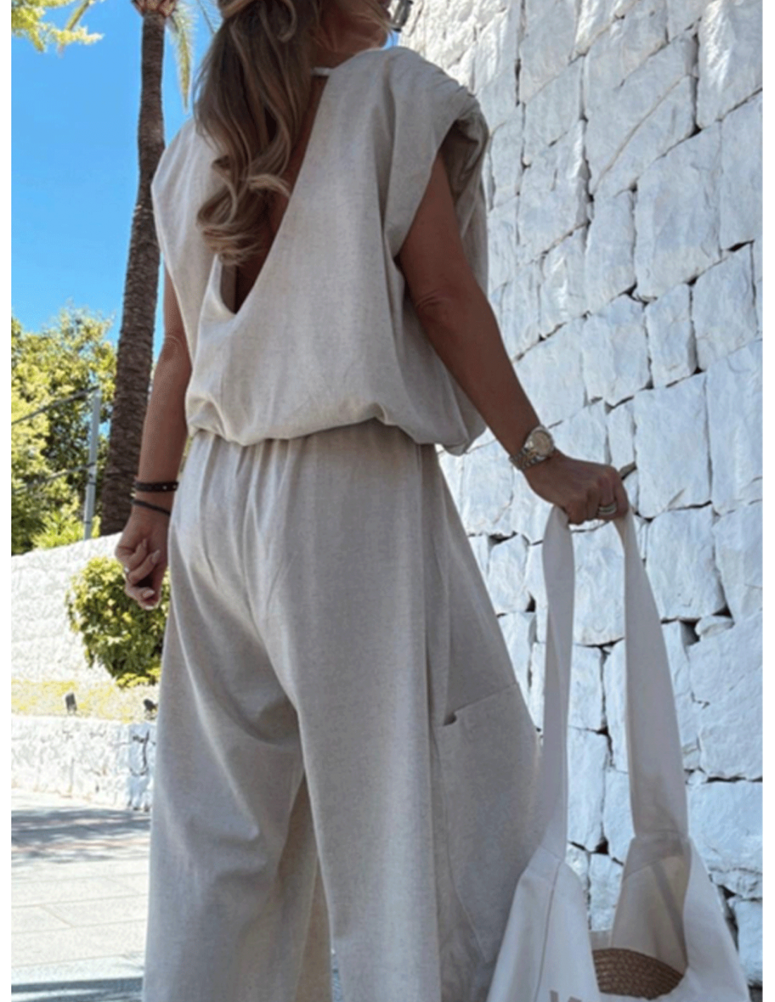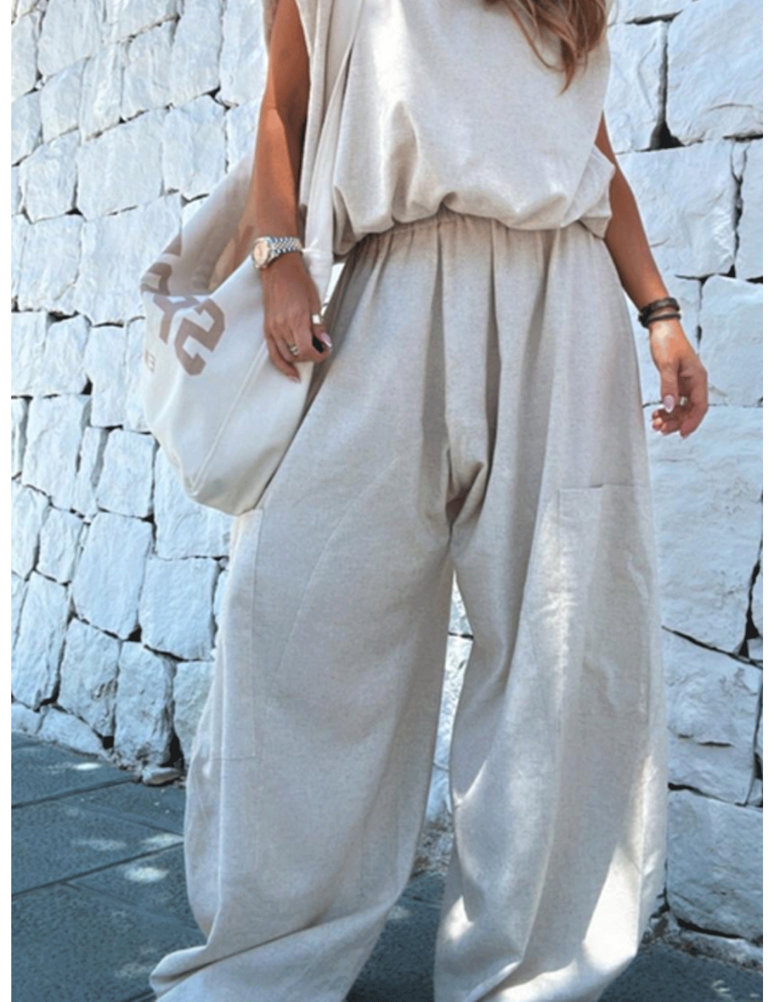 Stylowy lniany komplet z szerokimi spodniami ANEESA - beżowy
