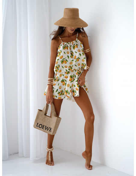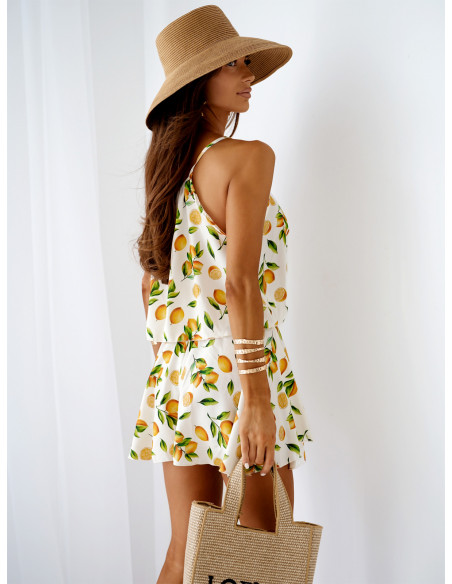 Składa się z oversizowego topu na wąskich ramiączkach oraz spódnico-spodenek uszytych z koła, które zapewniają maksymalną wygodę i swobodę ruchów w upalne dni.