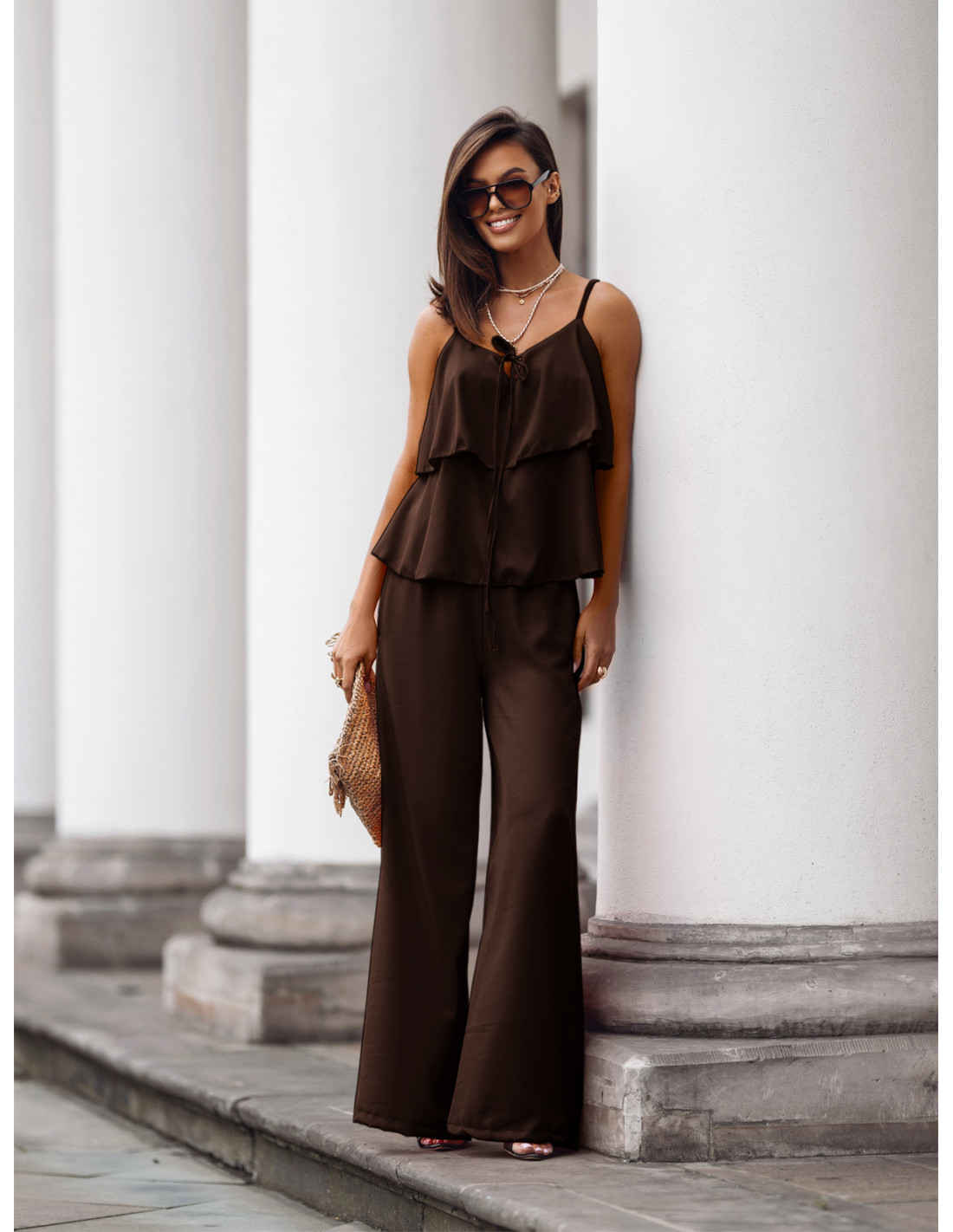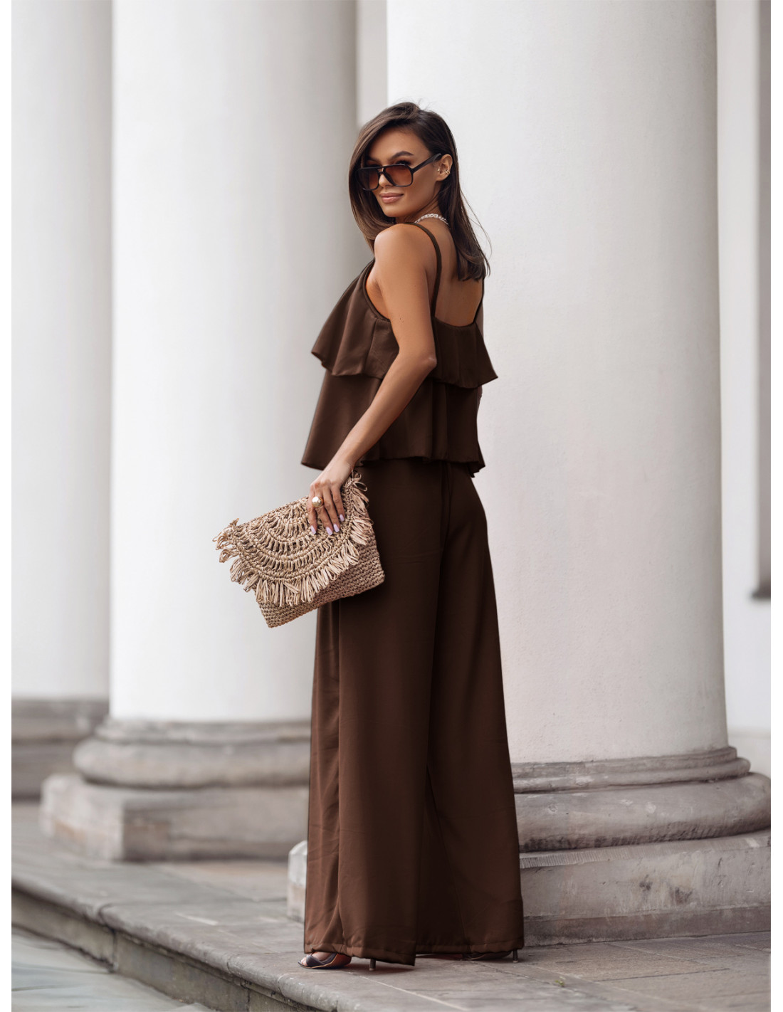 Komplet top z szerokimi spodniami AMARE - czekoladowy