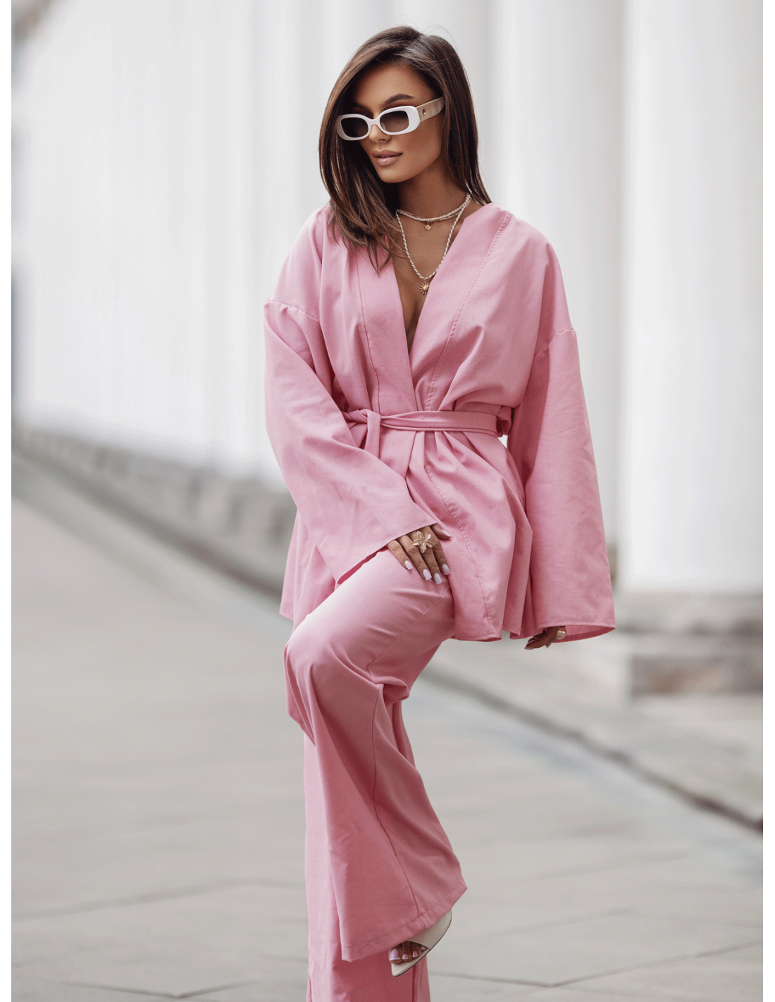Oversize'owe kimono z szerokimi rękawami i wiązaniem w talii pięknie podkreśla sylwetkę, a szerokie spodnie na gumie gwarantują komfort i swobodę ruchów.