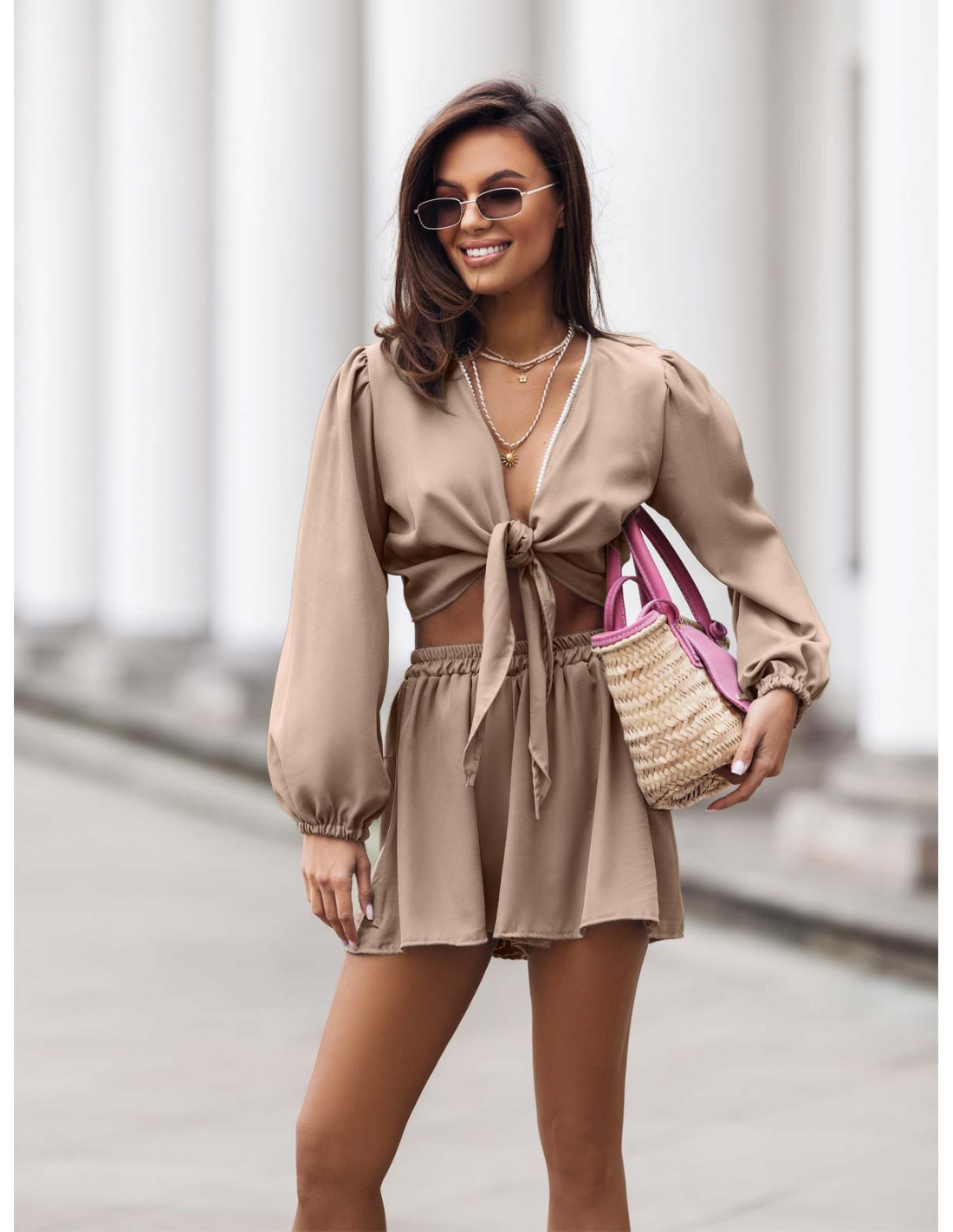 Modny komplet bluzka wiązana i spodenki AUREA - mocha mousse
