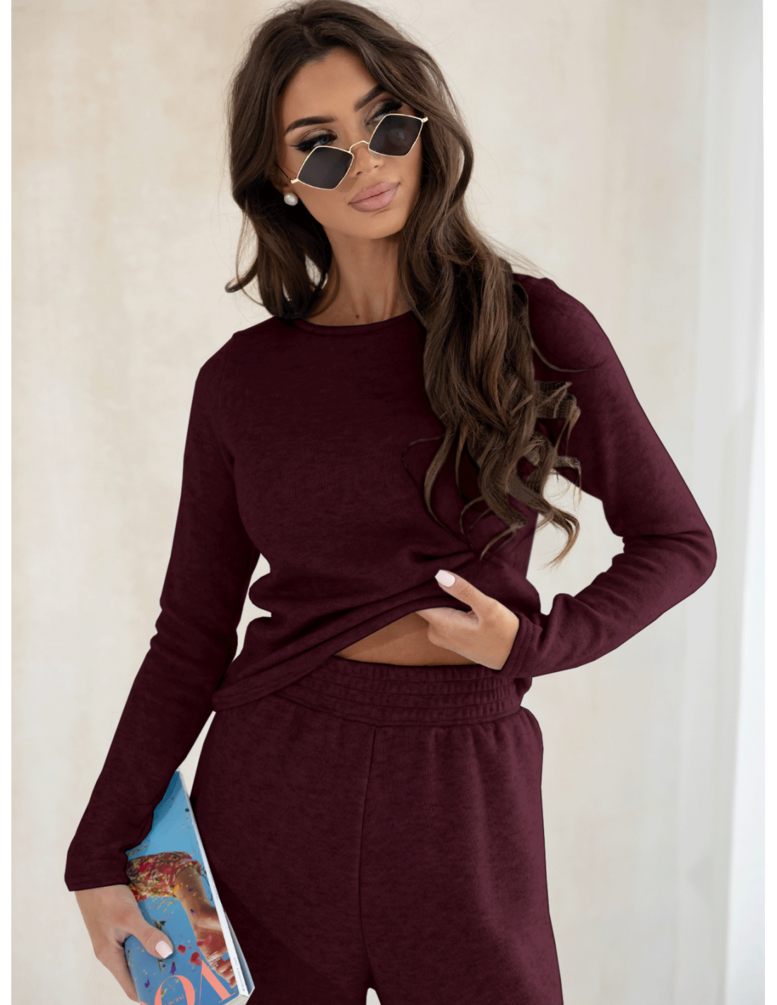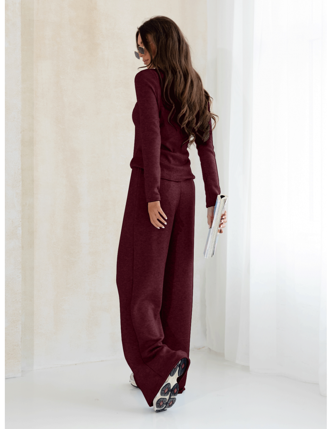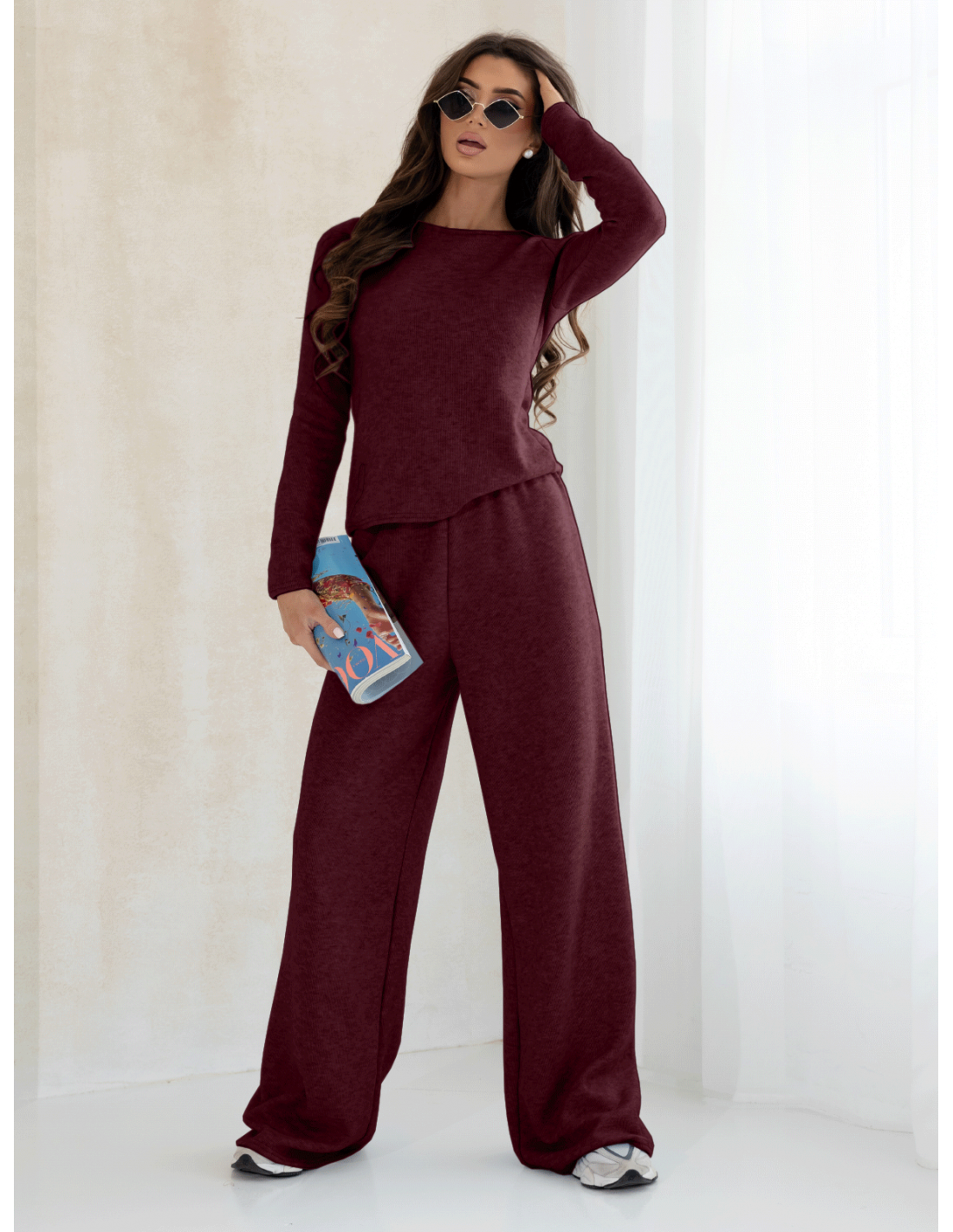 Komplet dzianinowy z szerokimi spodniami CELESTE - bordowy