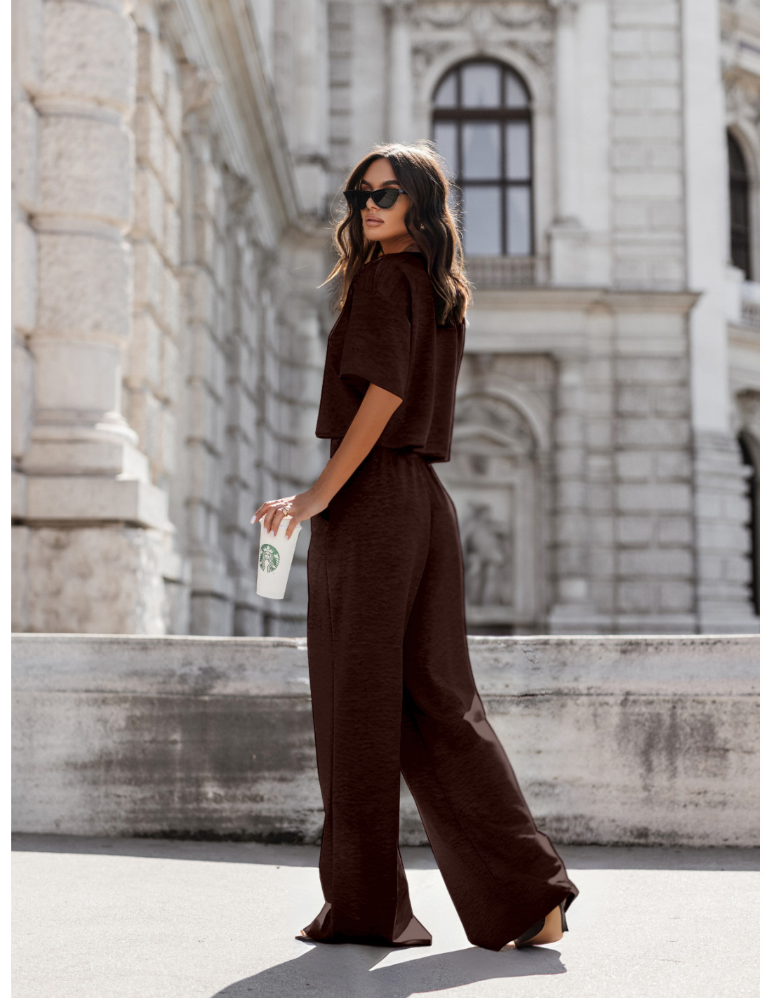Masełkowy komplet bluzka i szerokie spodnie ATRIA - czekoladowy