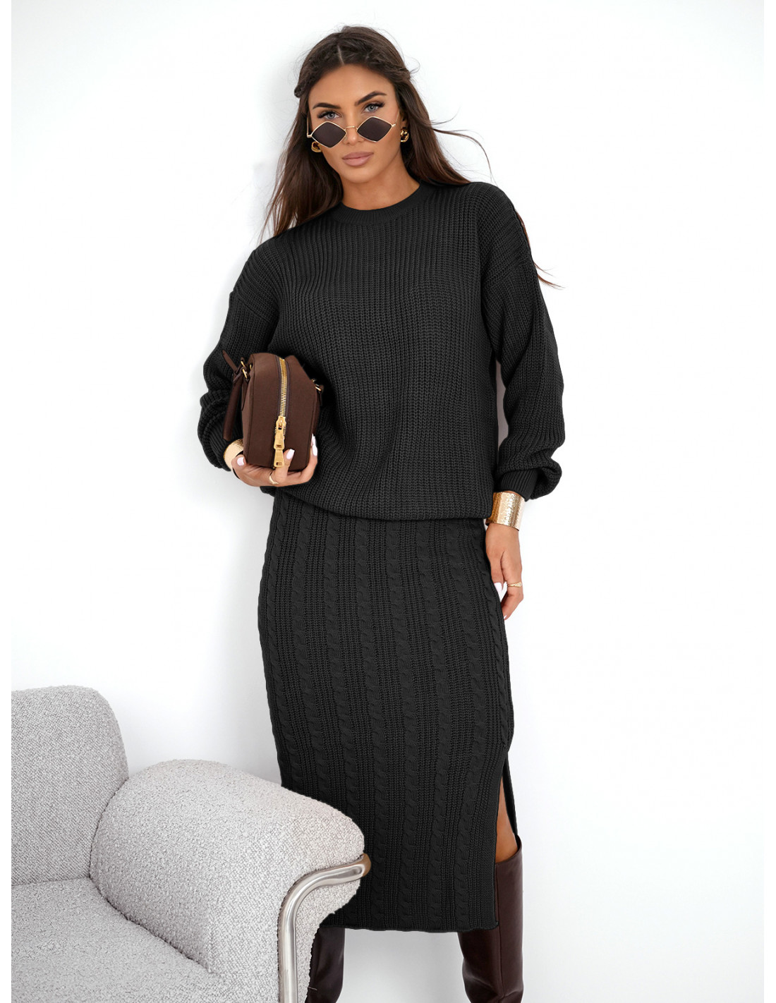 Składający się z klasycznego plecionego swetra z okrągłym dekoltem oraz wąskiej spódnicy midi z modnym wzorem w warkocze, ten zestaw łączy w sobie komfort i styl.