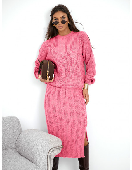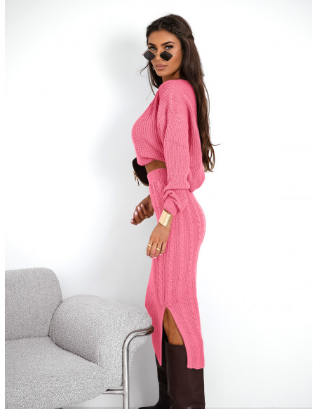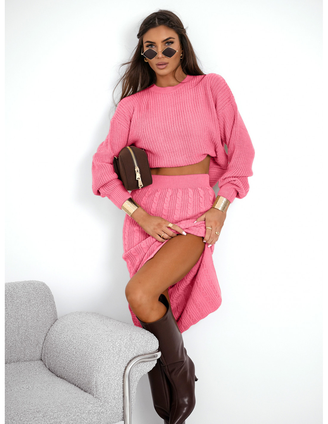 Składający się z klasycznego plecionego swetra z okrągłym dekoltem oraz wąskiej spódnicy midi z modnym wzorem w warkocze, ten zestaw łączy w sobie komfort i styl.