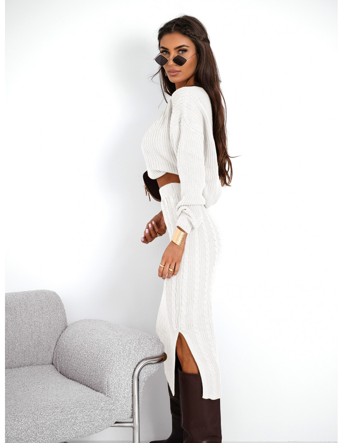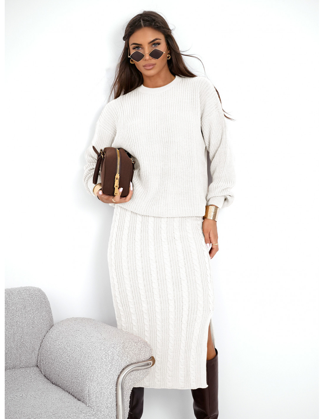 Składający się z klasycznego plecionego swetra z okrągłym dekoltem oraz wąskiej spódnicy midi z modnym wzorem w warkocze, ten zestaw łączy w sobie komfort i styl.