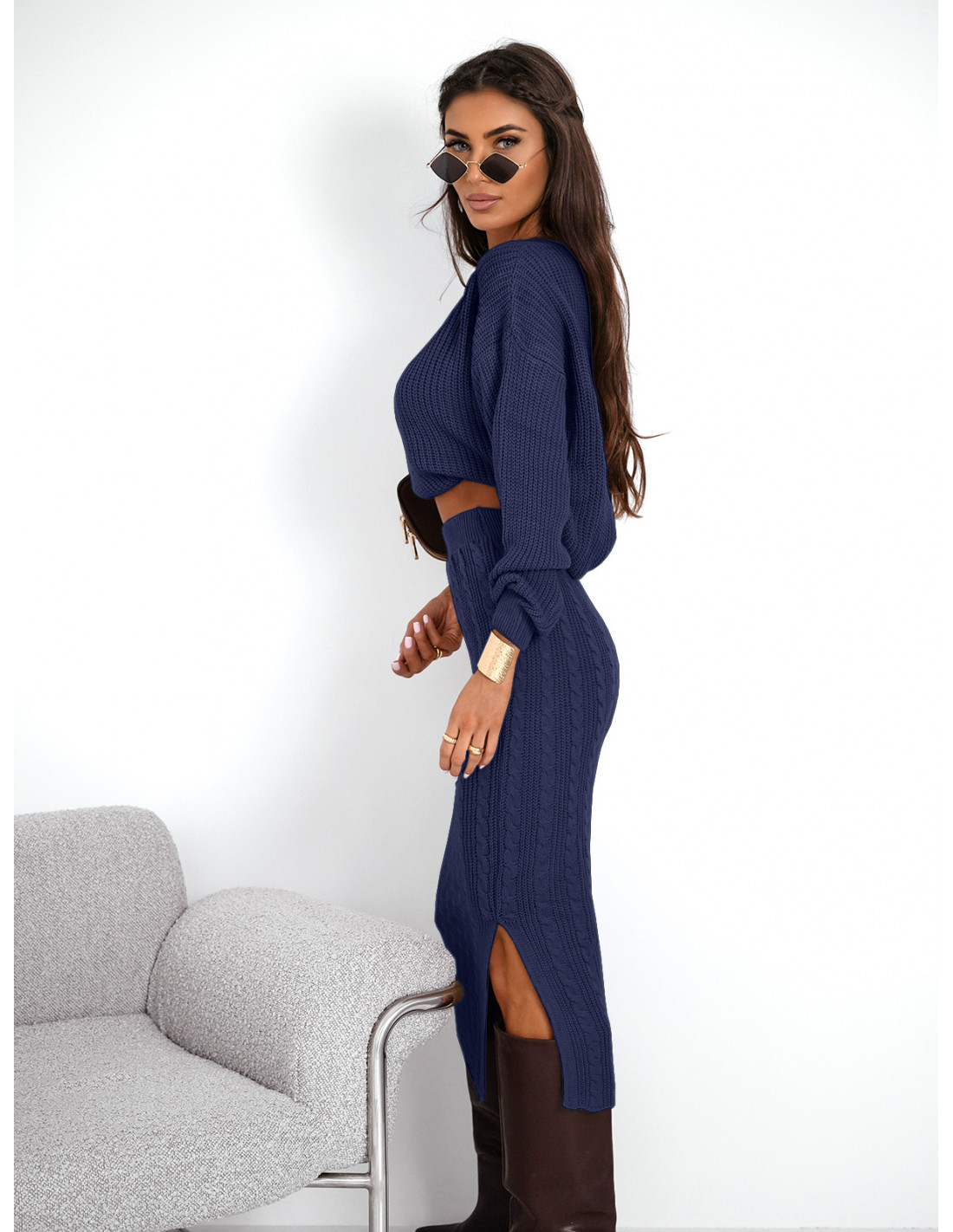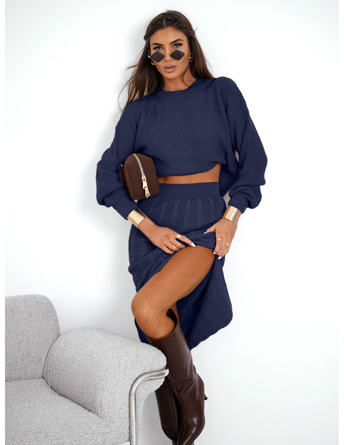 Komplet dzianinowy ze spódnicą XANTI - granatowy