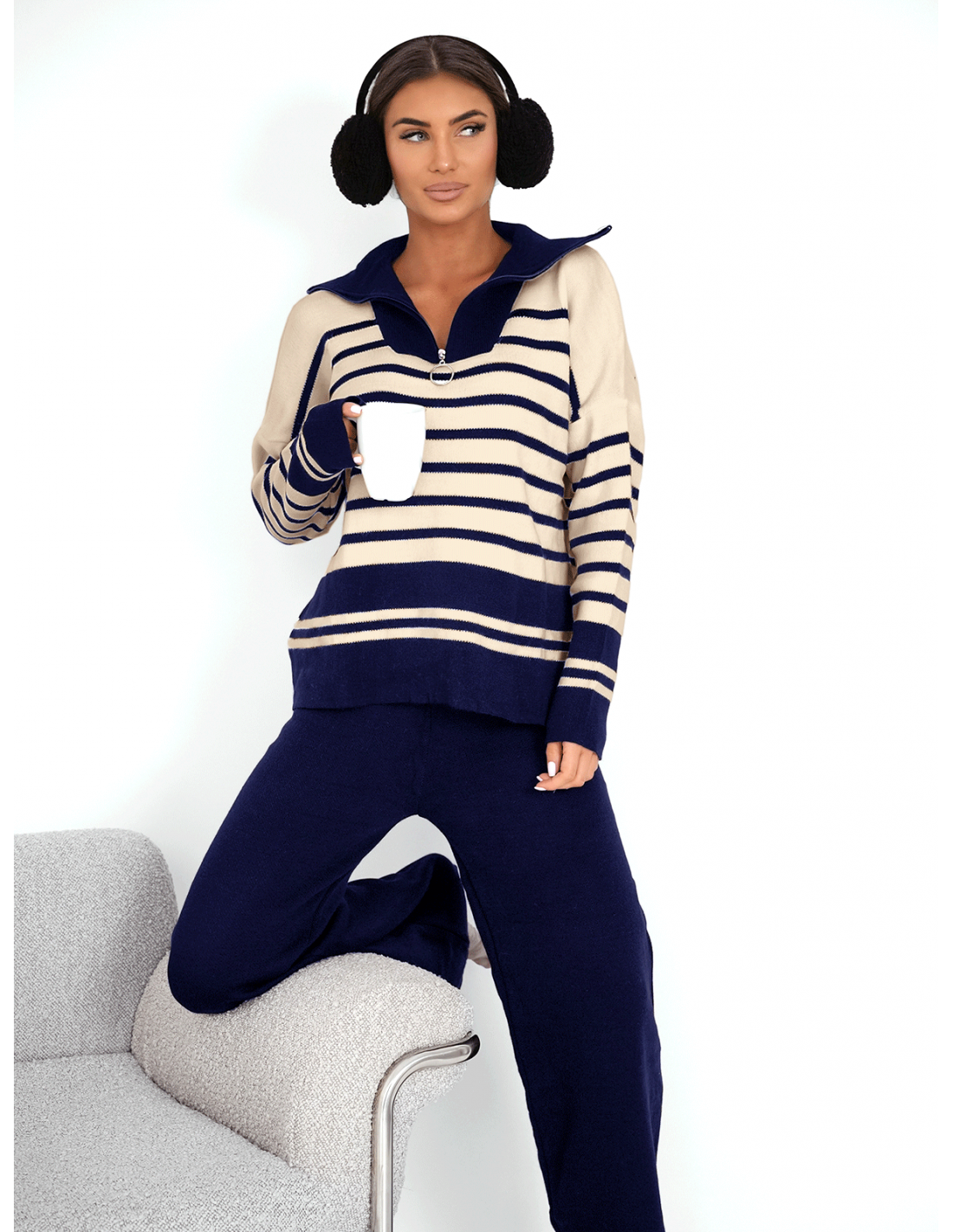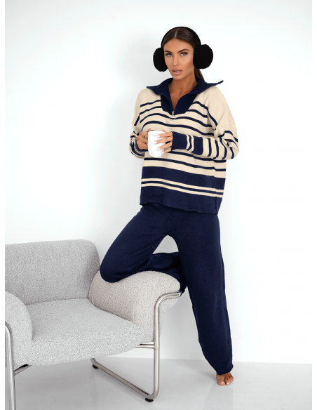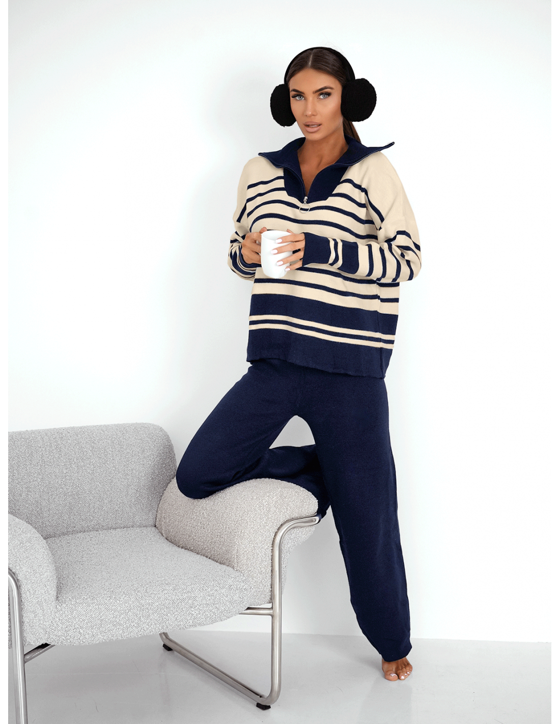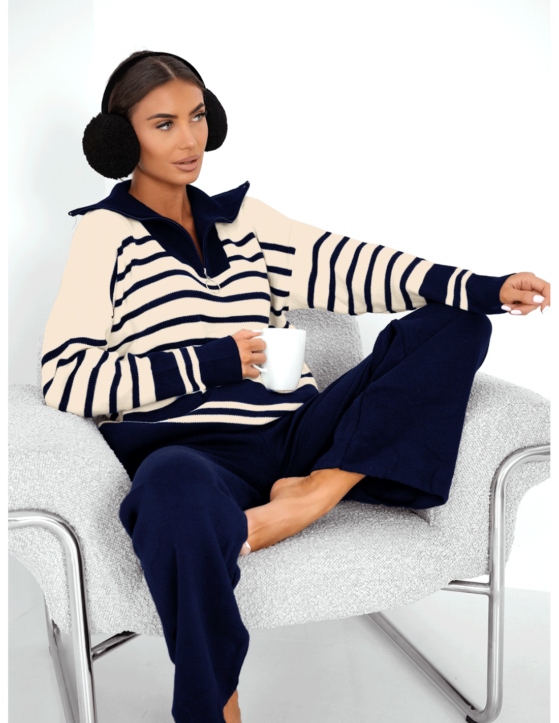 Składa się z komfortowego zestawu – swetra oversize z zamkiem na dekolcie i szerokich spodni z gumką w pasie, które gwarantują pełną swobodę ruchów.