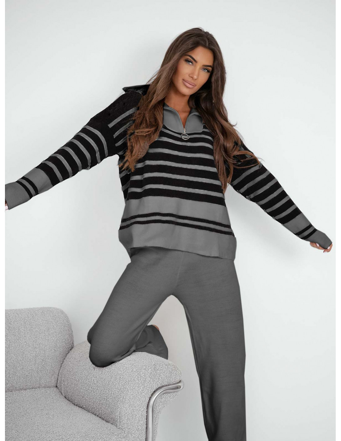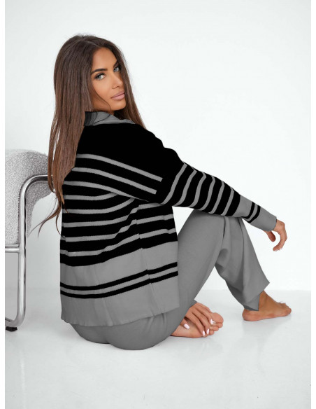 Składa się z komfortowego zestawu – swetra oversize z zamkiem na dekolcie i szerokich spodni z gumką w pasie, które gwarantują pełną swobodę ruchów.