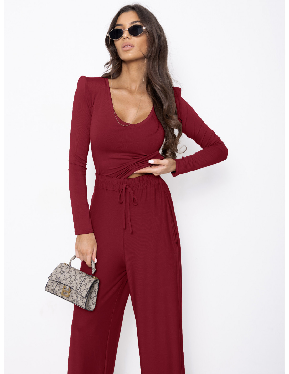 WP Komplet z wiskozy bluzka i szerokie spodnie - bordowy