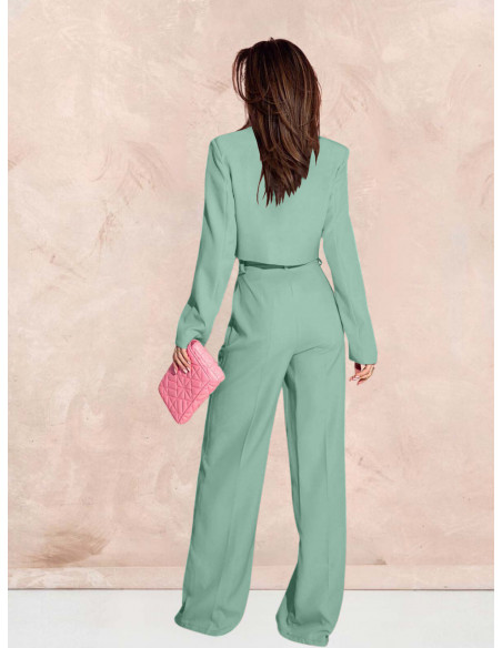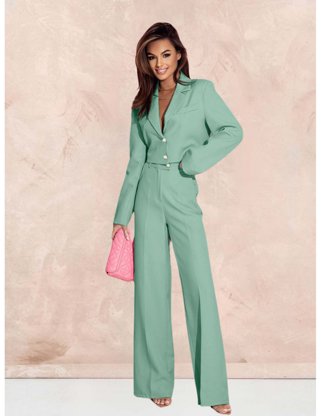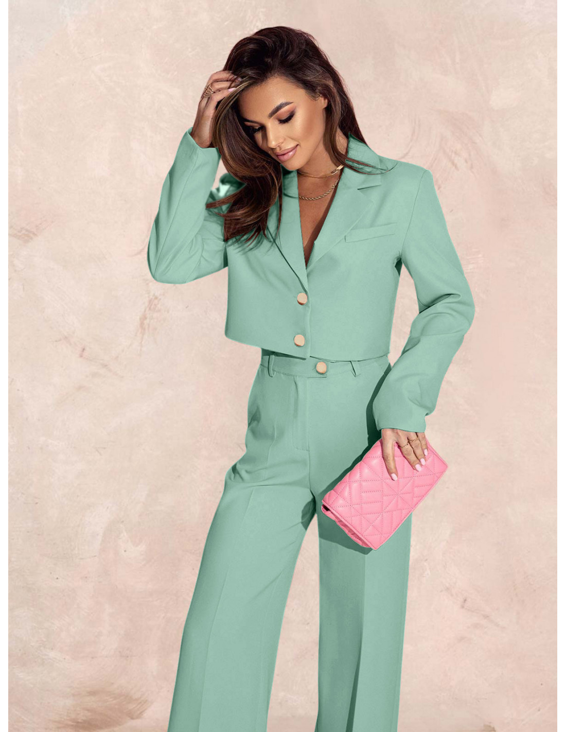 Krótka marynarka zapinana na dwa guziki podkreśli Twoją talię, a szerokie nogawki spodni optycznie wydłużą nogi, gwarantując nienaganną sylwetkę.