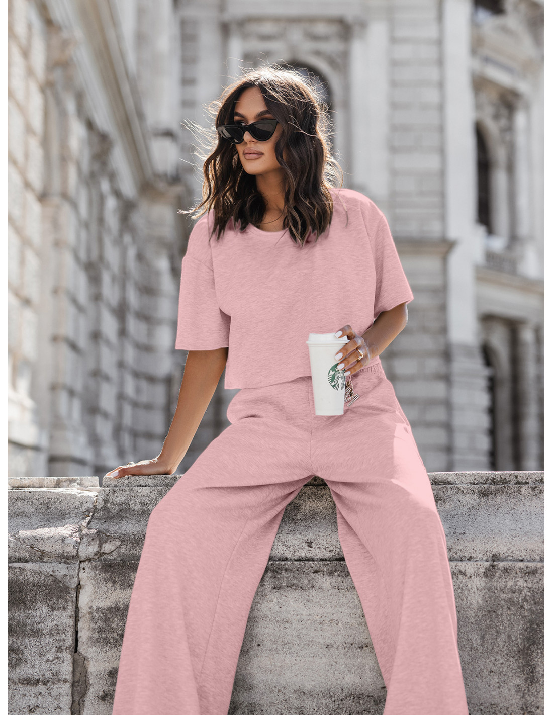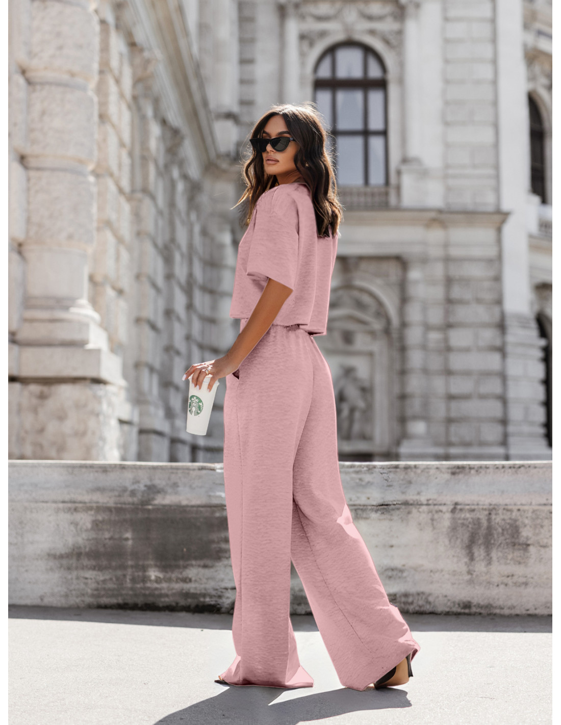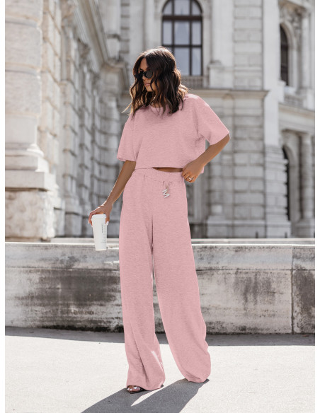 Masełkowy komplet bluzka i szerokie spodnie ATRIA - pudrowy róż