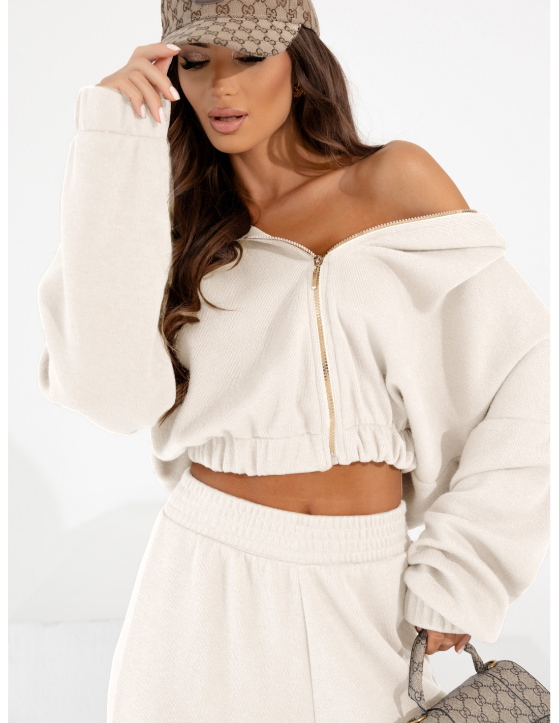 Oversizowa bluza z kapturem i efektownym złotym zamkiem dodaje całości sportowej elegancji, a szerokie rękawy i luźny krój zapewniają komfort noszenia.