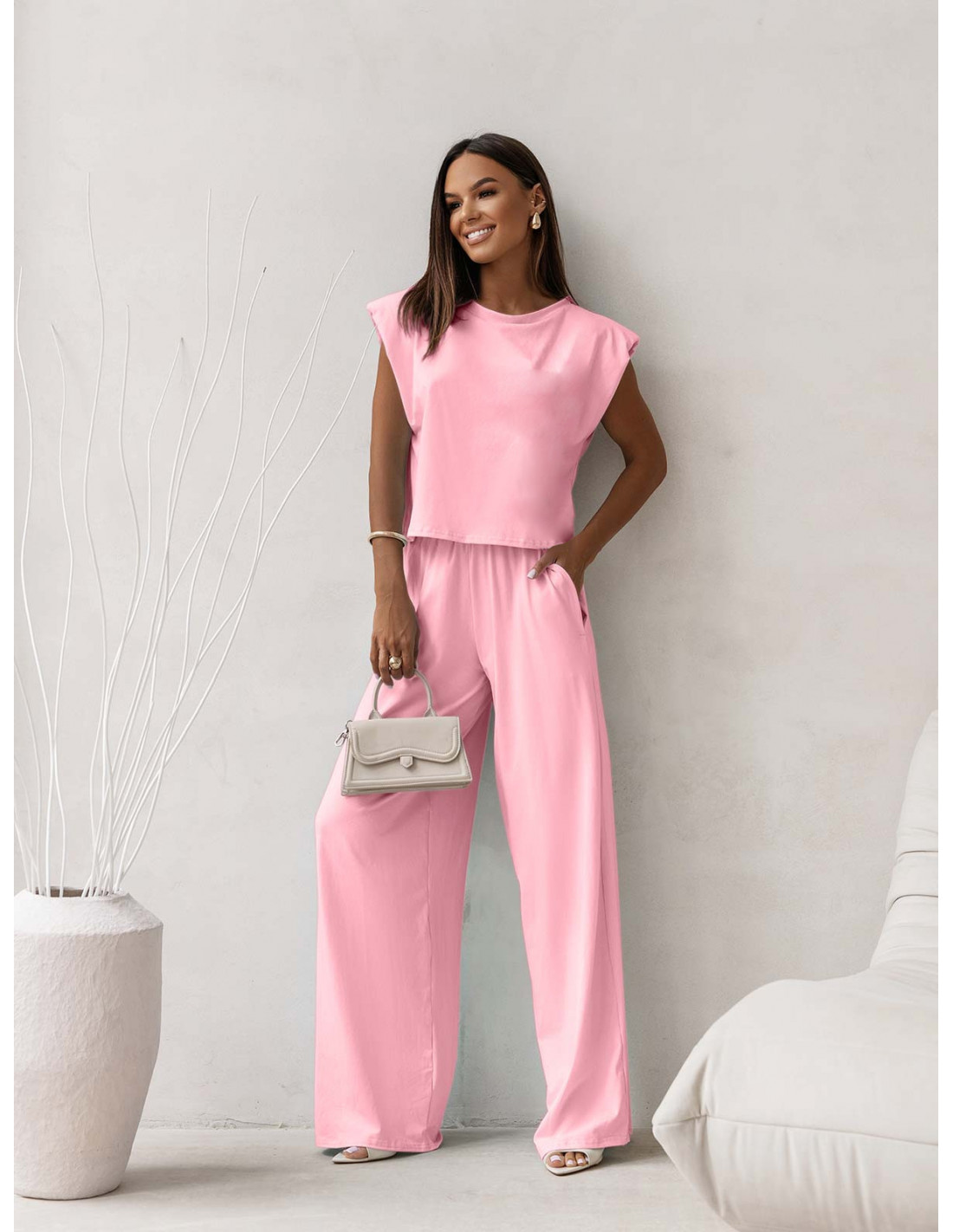 WP Bawełniany komplet top i szerokie spodnie - pudrowy róż