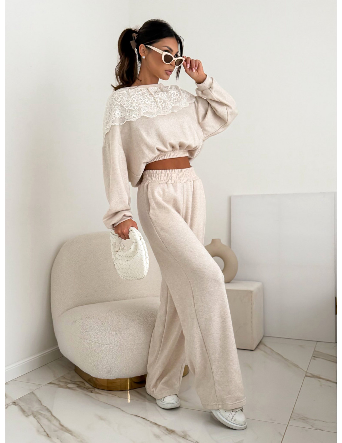 Miękki sweterkowy dres wykonany z przyjemnej w dotyku bawełny zachwyca delikatnym wykończeniem – subtelna koronka dodaje całości lekkości i stylowego charakteru.