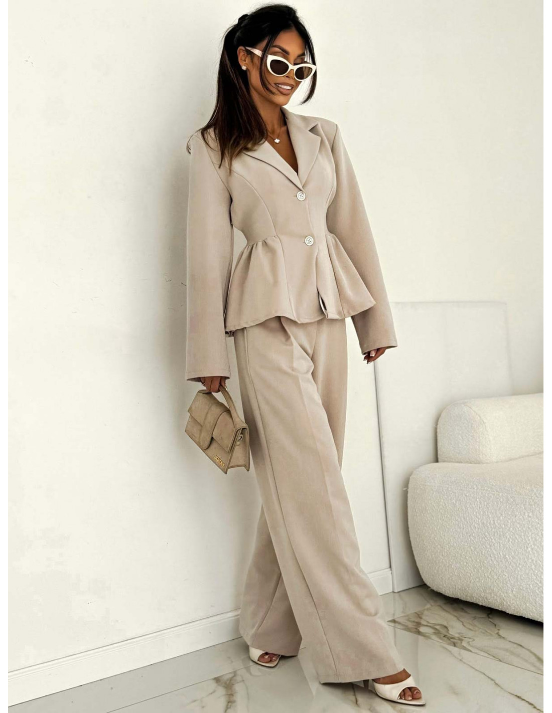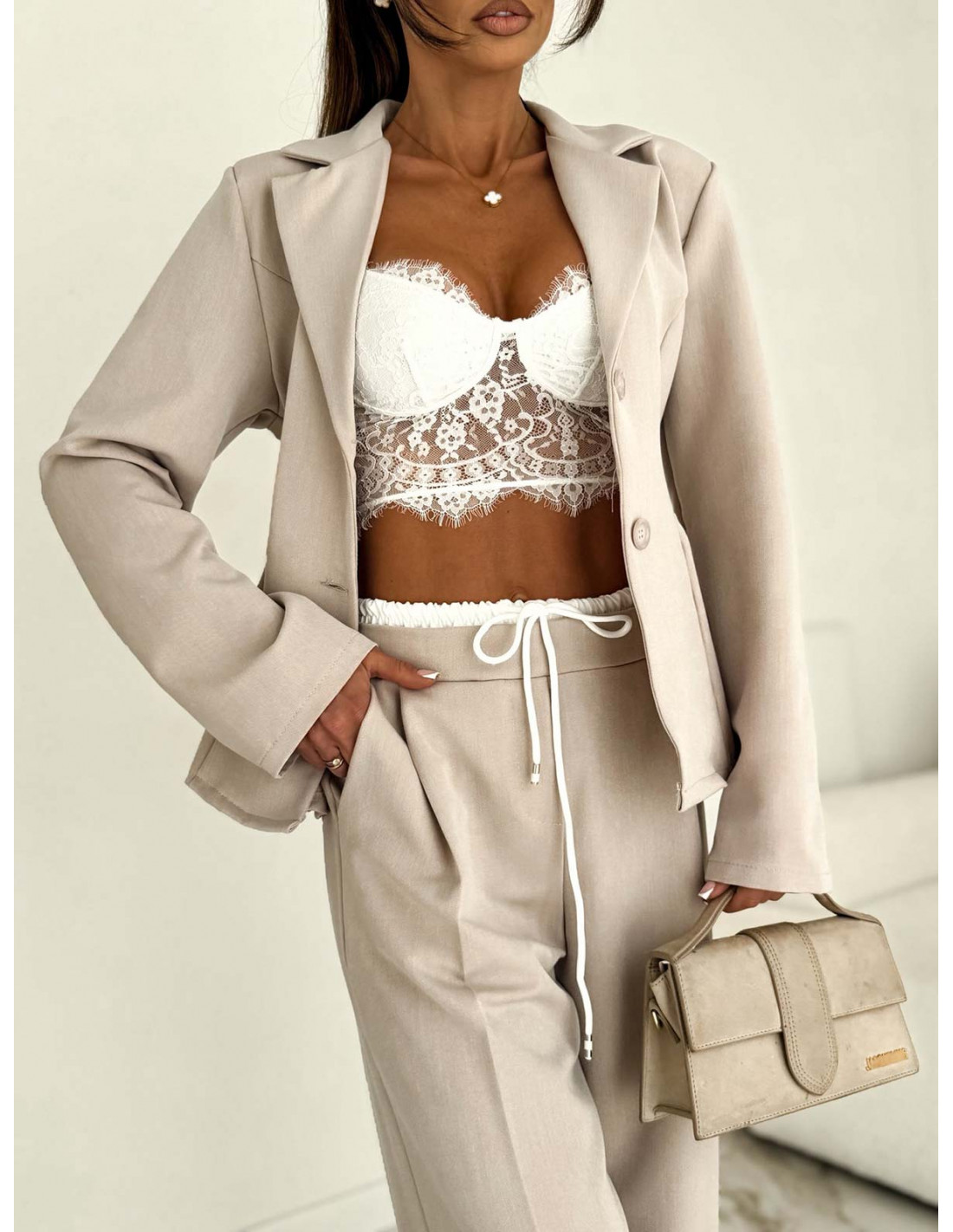 Składa się z taliowanej marynarki bez podszewki, która pięknie podkreśla sylwetkę i zapewnia komfort noszenia nawet w cieplejsze dni.