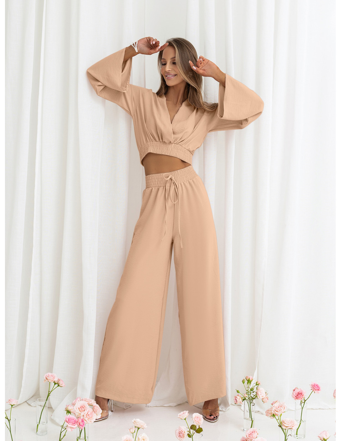 Komplet crop top z szerokimi spodniami SERRINA - beżowy