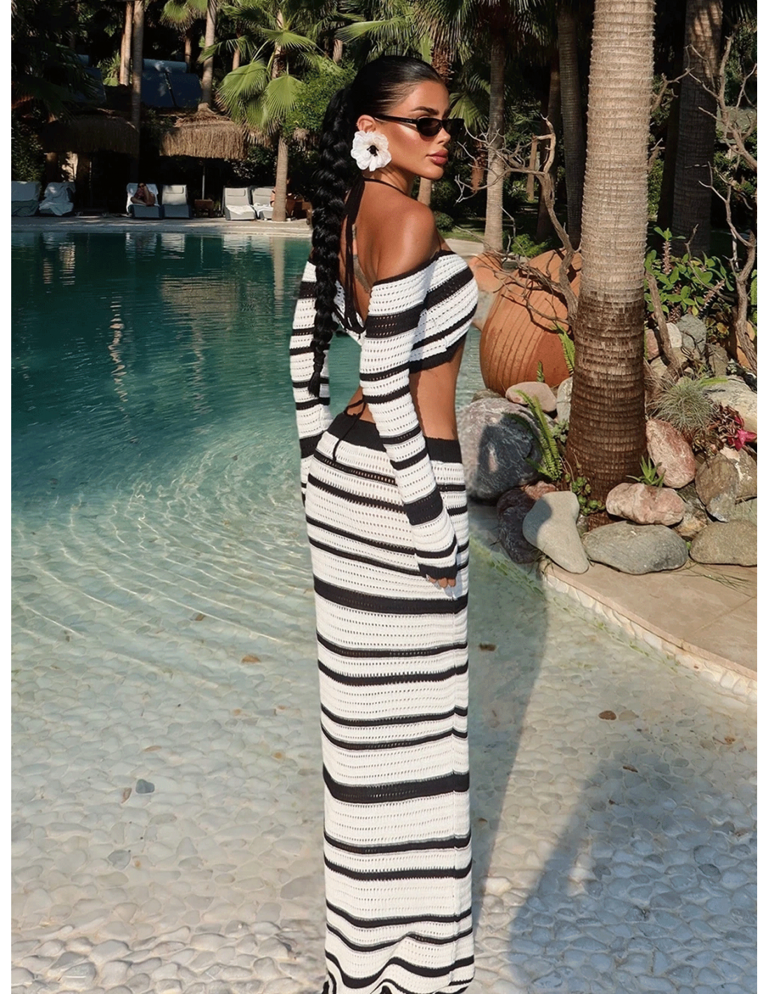 Ażurowy zestaw składa się z krótkiego topu z długim rękawem, który efektownie podkreśla sylwetkę i przyciąga spojrzenia.