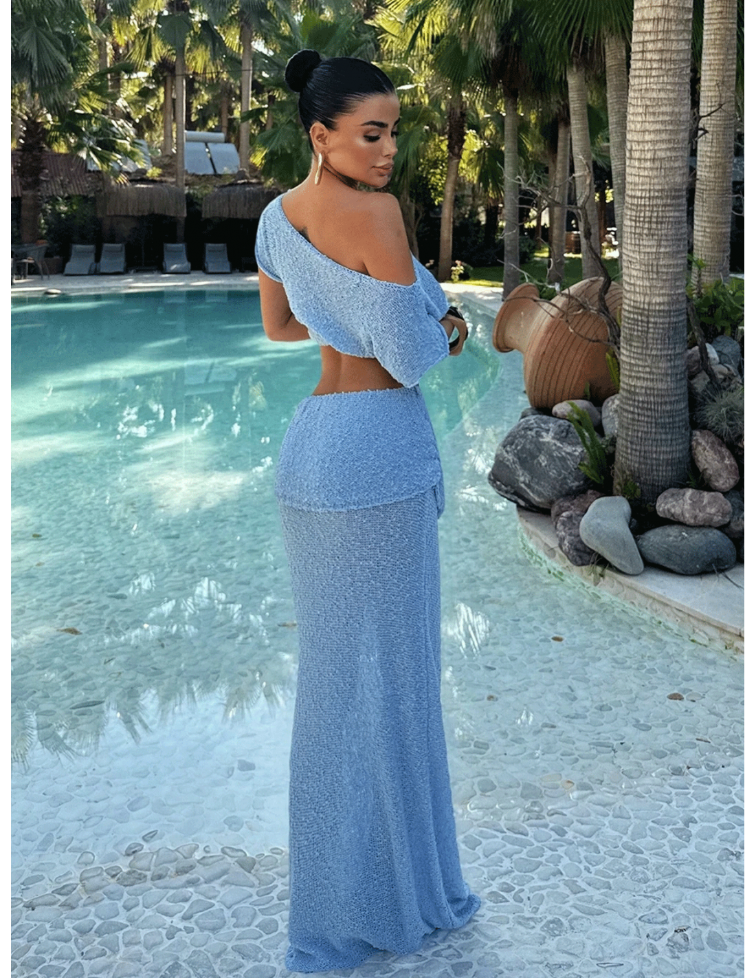 Modny ażurowy komplet bluzka i spódnica maxi MABLE - błękitny