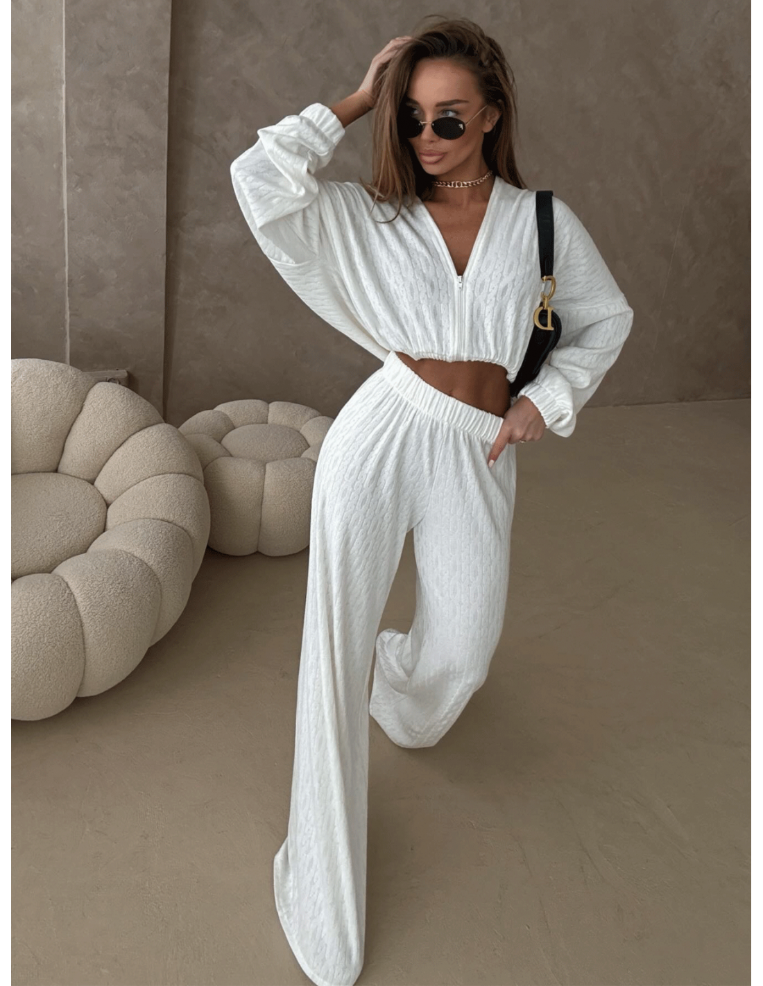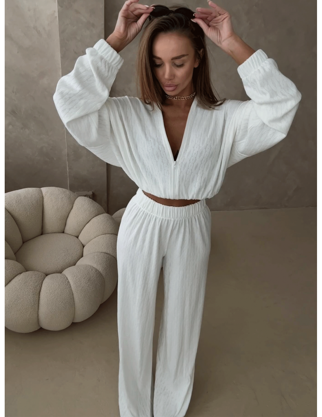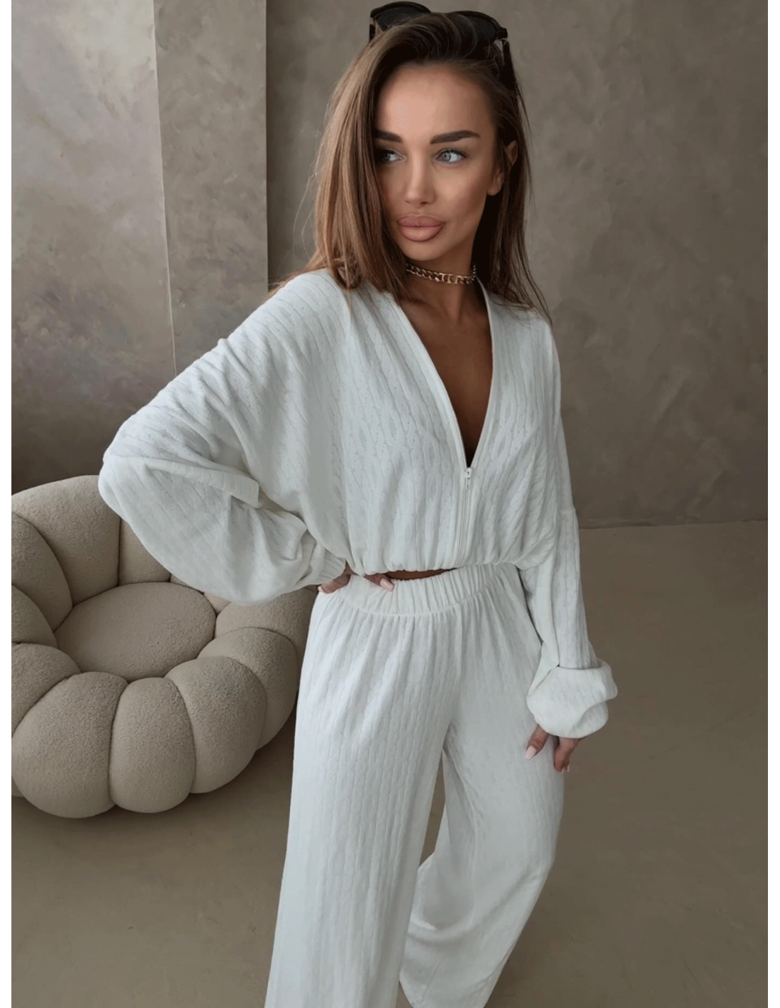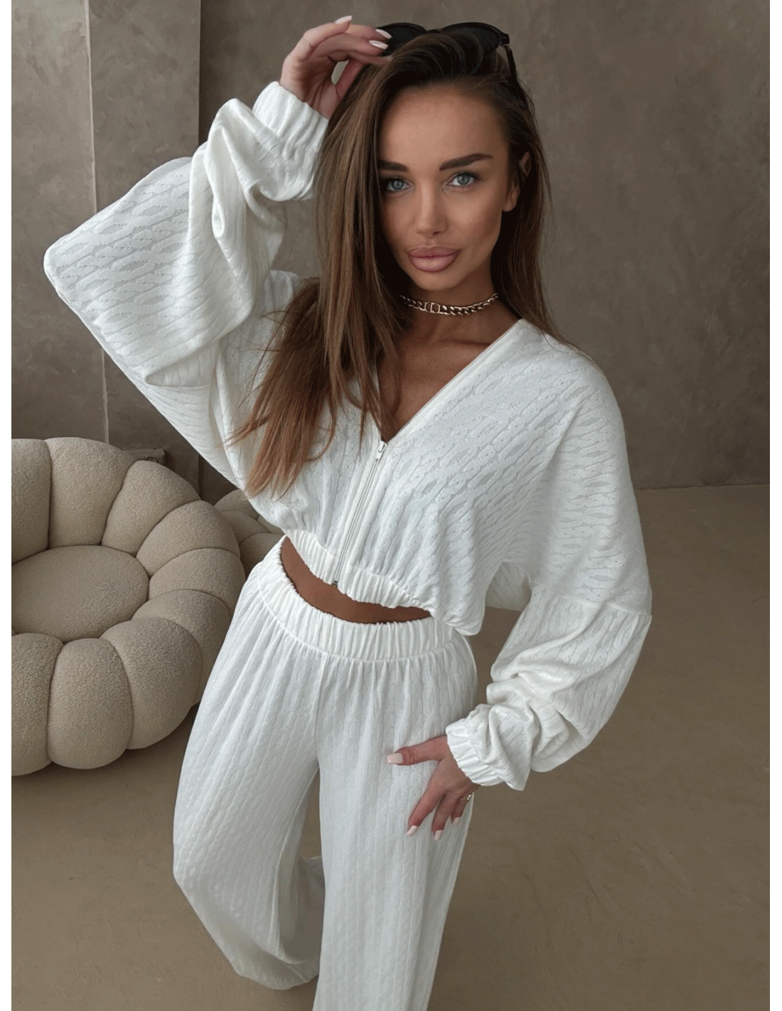 Stylowy komplet z plecionej dzianiny KIKI to idealne połączenie wygody i modnego wyglądu.