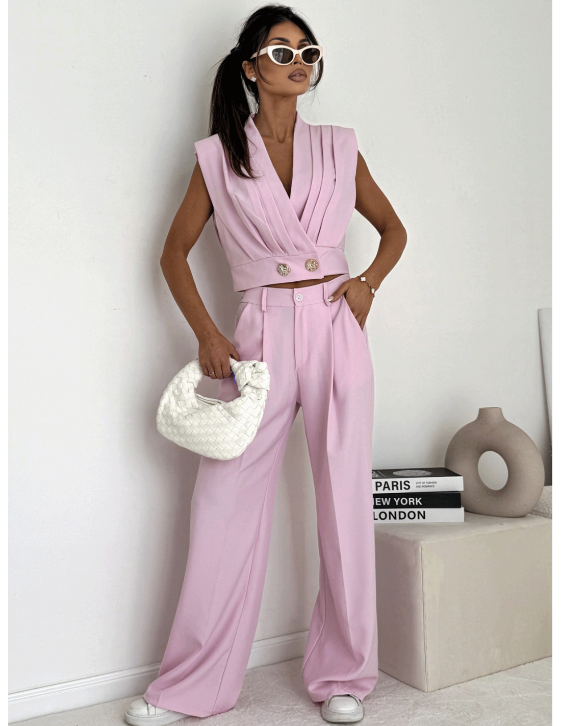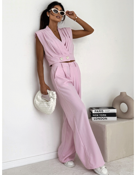 Elegancki komplet z szerokimi spodniami KOZUE - pudrowy róż