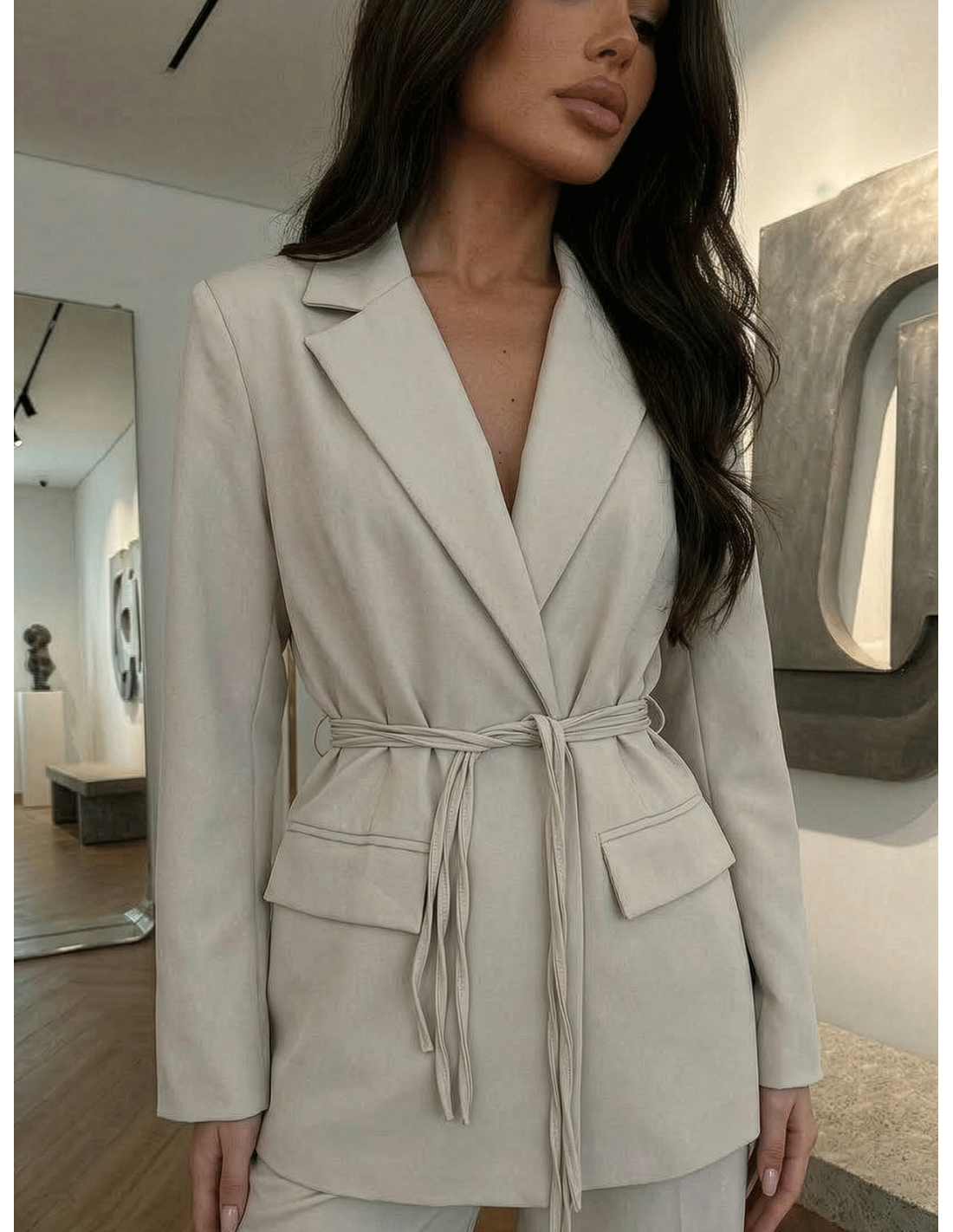 Stylowy komplet marynarka z wiązaniem i spodnie TOYAH - beżowy