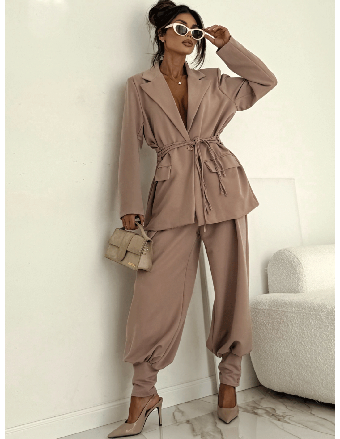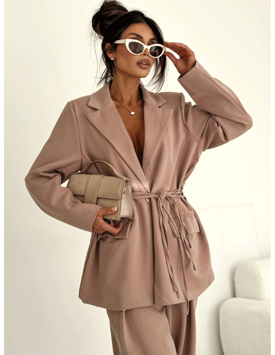 Stylowy komplet marynarka z wiązaniem i spodnie TOYAH - brudny róż