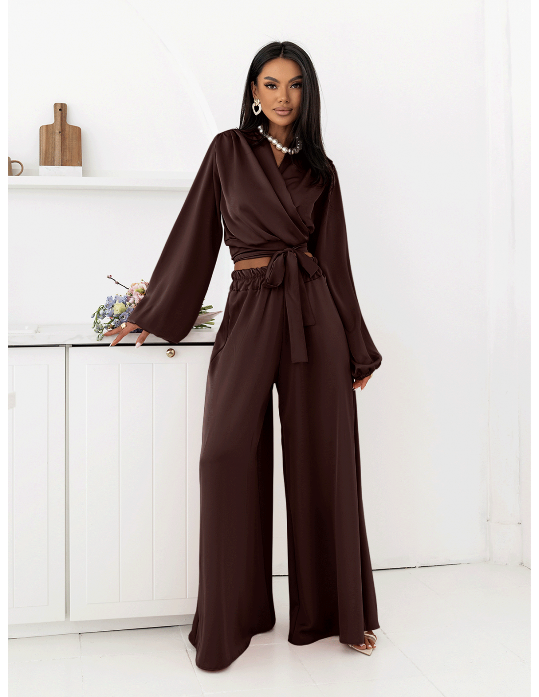 Satynowy komplet z szerokimi spodniami TAITHI - czekoladowy