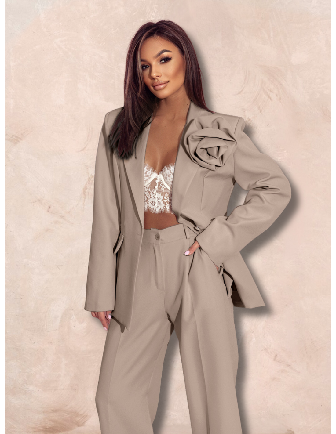 To idealny biurowy look, który łączy elegancję z nowoczesnością i sprawia, że garnitur w kolorze mocha mousse staje się inwestycją w ponadczasową klasykę.