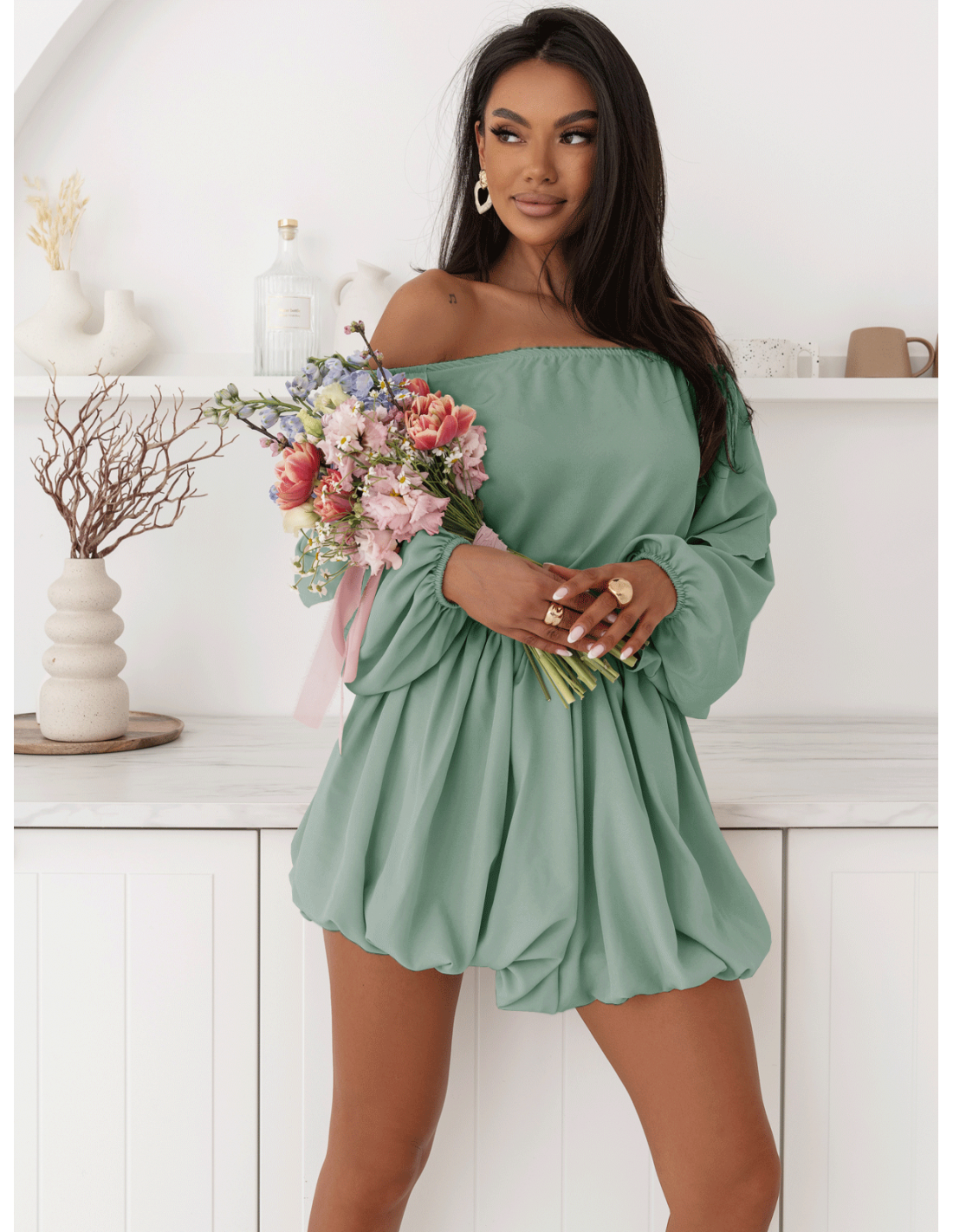 Rękawy zakończone gumką tworzą efekt delikatnej objętości, który pięknie układa się w ruchu.