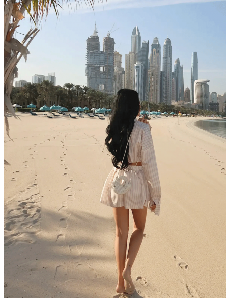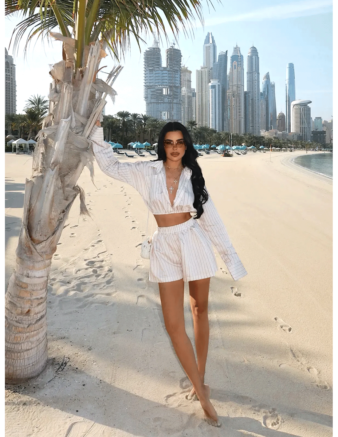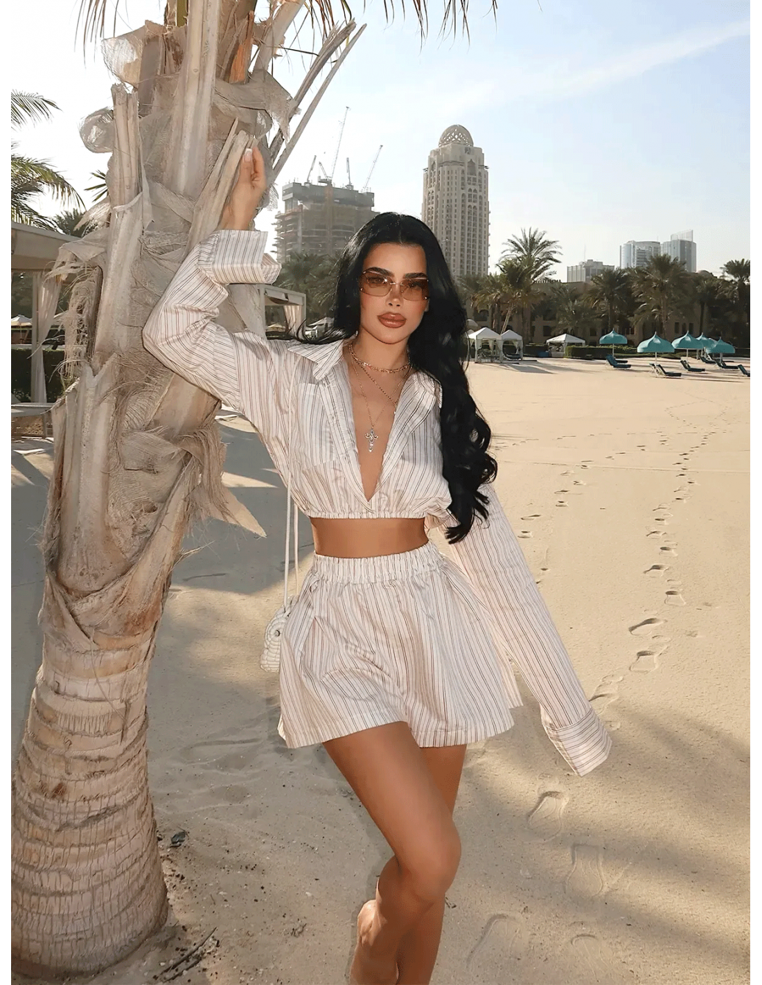 Krótka koszula z kołnierzykiem i długim rękawem subtelnie podkreśla sylwetkę, a szorty z wysokim stanem zapewniają wygodę przez cały dzień.