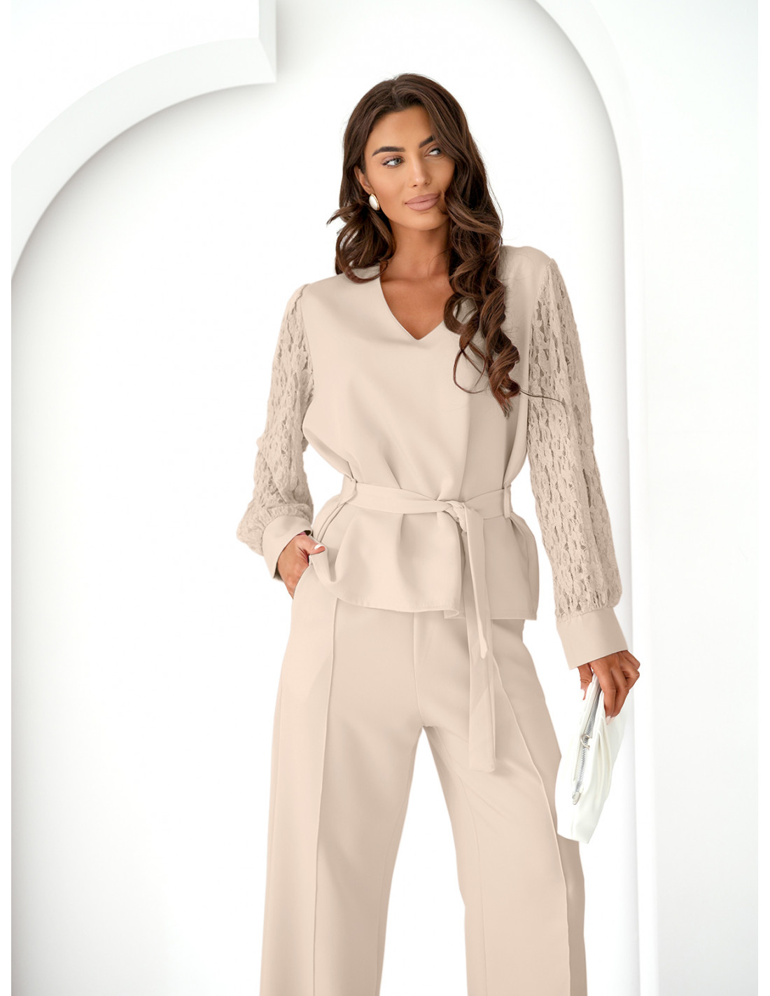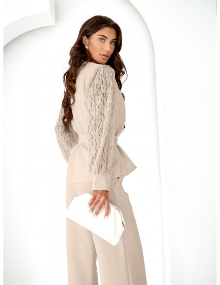 Komplet bluzka z rękawami z koronki i spodnie ROST - beżowy