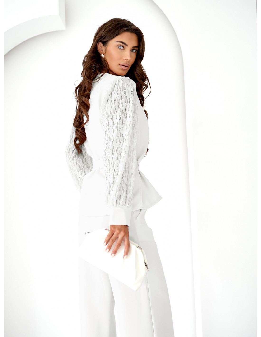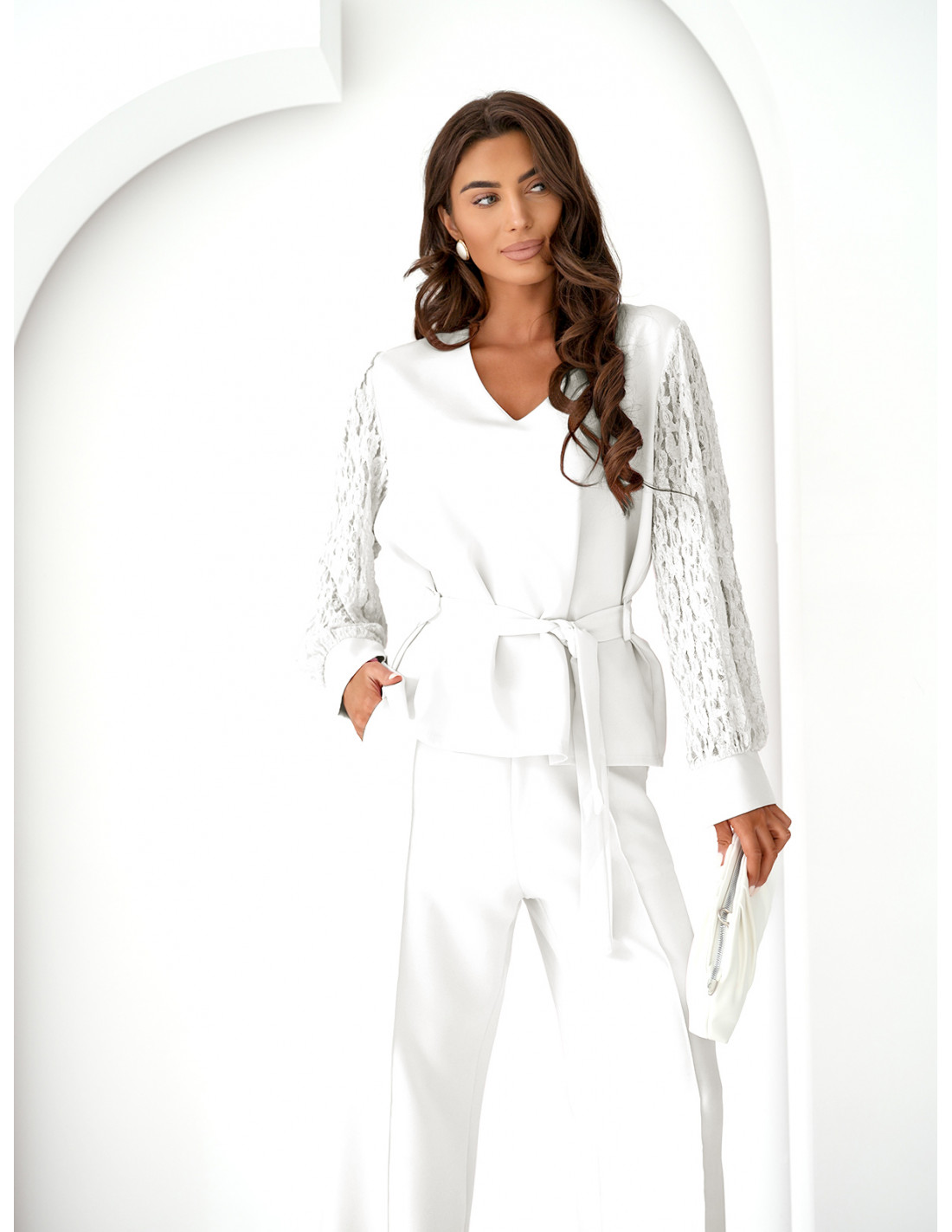Komplet bluzka z rękawami z koronki i spodnie ROST - biały
