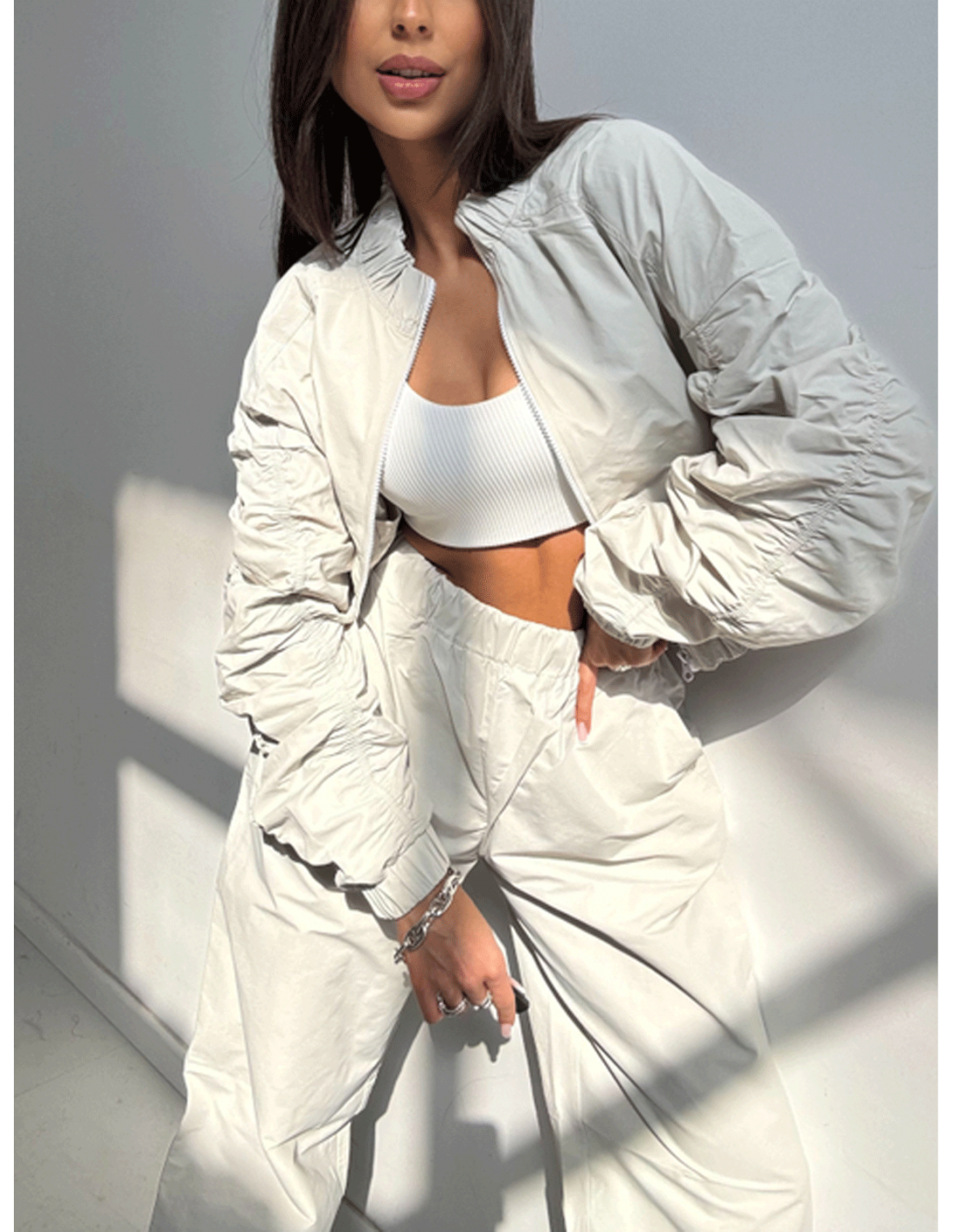 Krótka bluza zapinana na zamek z elastycznym ściągaczem na dole i stójką na gumce tworzy nowoczesną, sportowo-elegancką formę, która świetnie podkreśla sylwetkę.