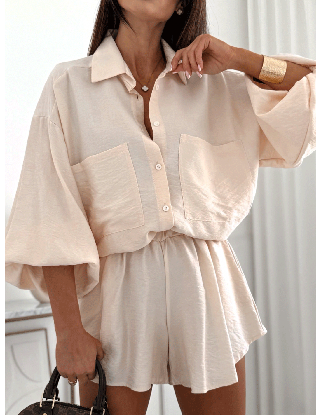 Koszula oversize zapinana na guziki nadaje stylizacji swobodnego, modowego charakteru, a praktyczne kieszenie z przodu dodają funkcjonalności.