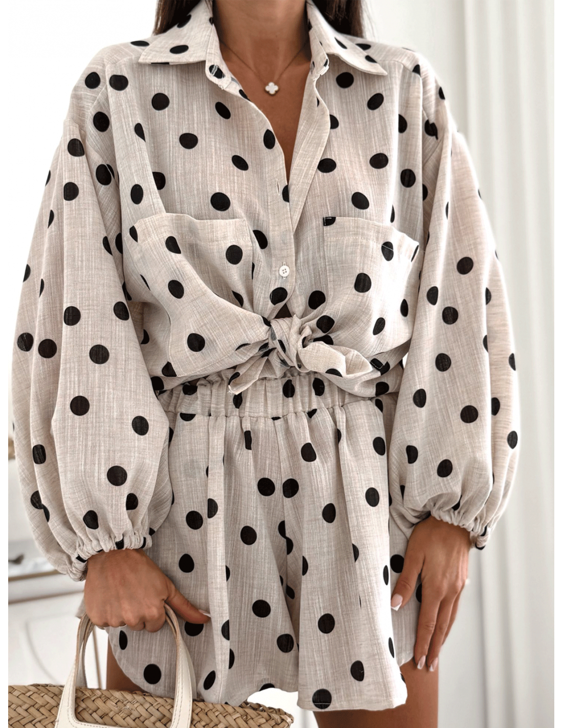 Koszula oversize zapinana na guziki nadaje stylizacji swobodnego, modowego charakteru, a praktyczne kieszenie z przodu dodają funkcjonalności.