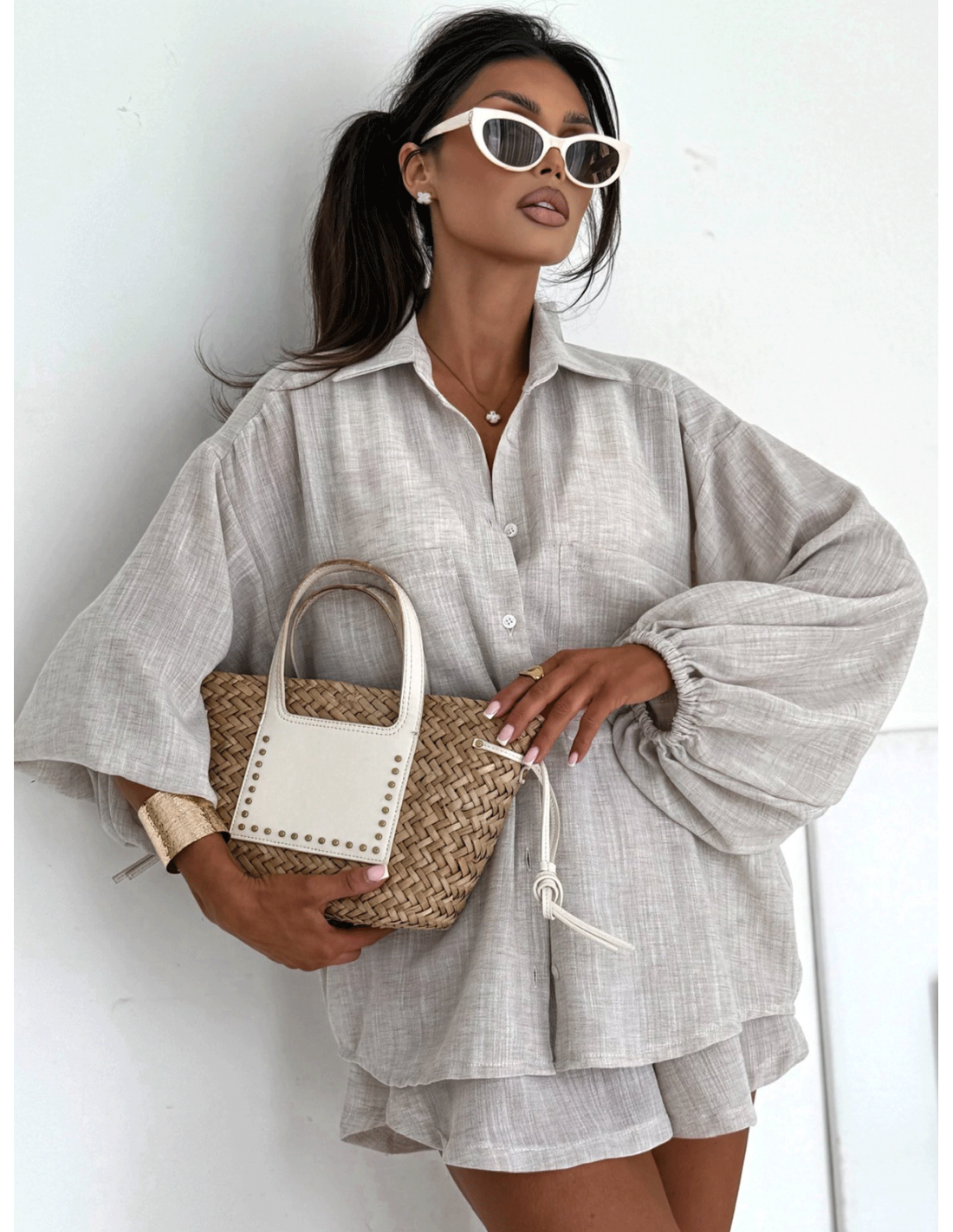Koszula oversize zapinana na guziki nadaje stylizacji swobodnego, modowego charakteru, a praktyczne kieszenie z przodu dodają funkcjonalności.