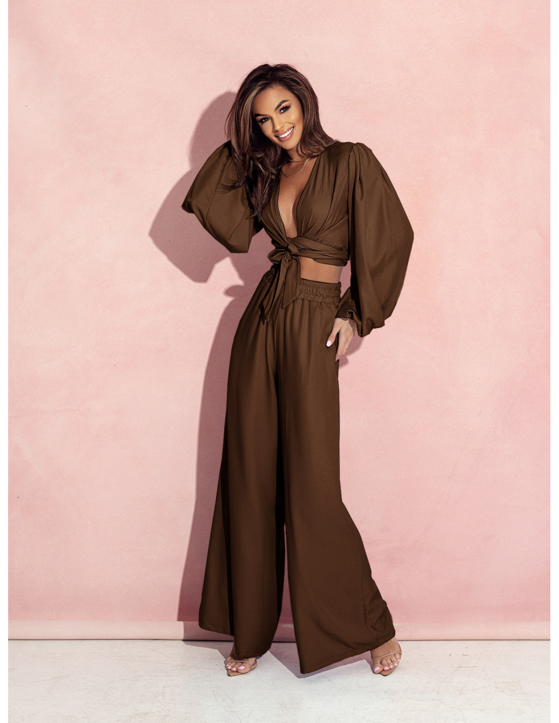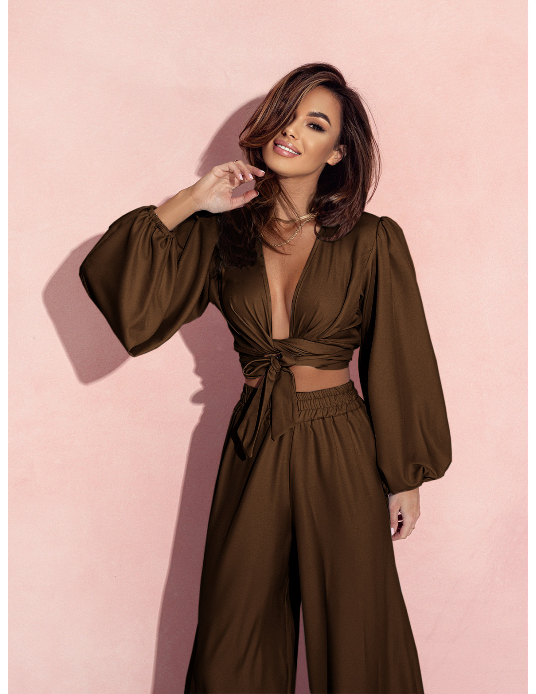 Elegancki komplet z wiązaną bluzką SHARPAY - czekoladowy