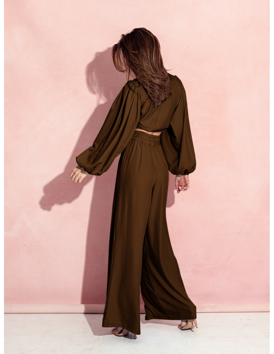 Ten elegancki, dwuczęściowy komplet w odcieniu czekolady to esencja kobiecej elegancji i nowoczesnego stylu.