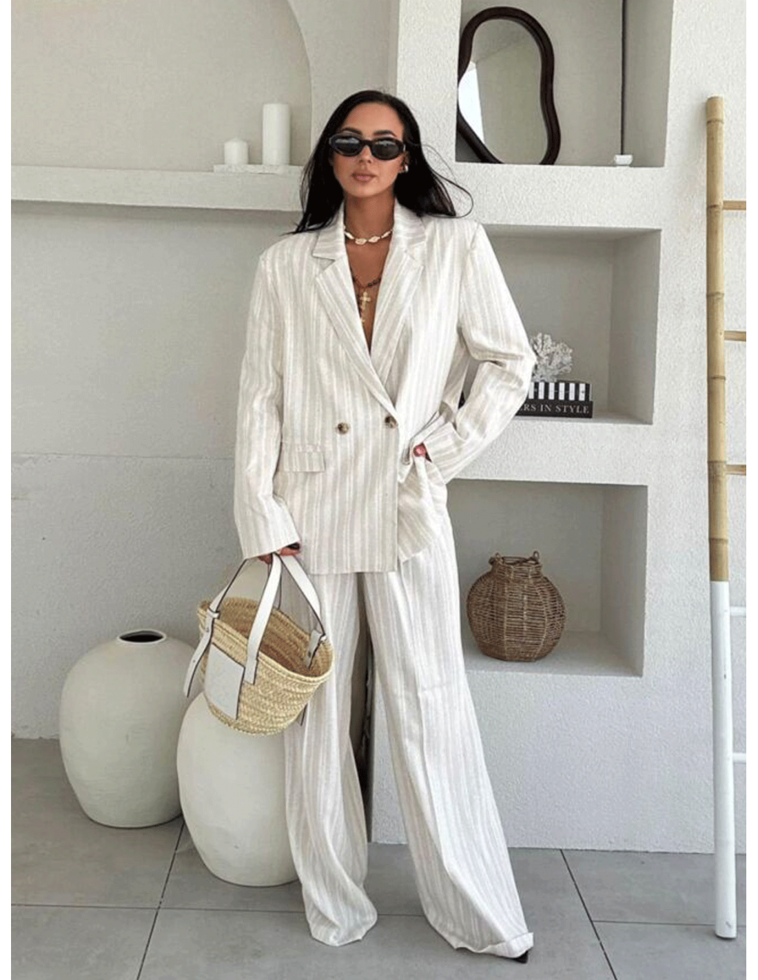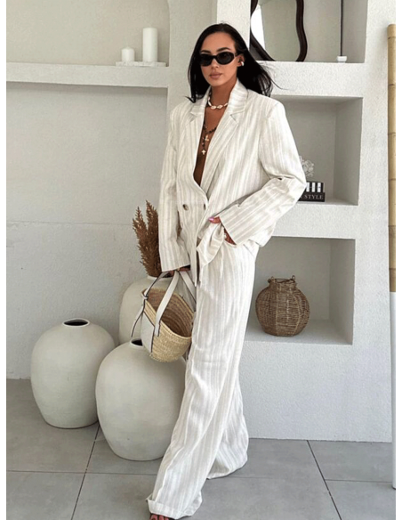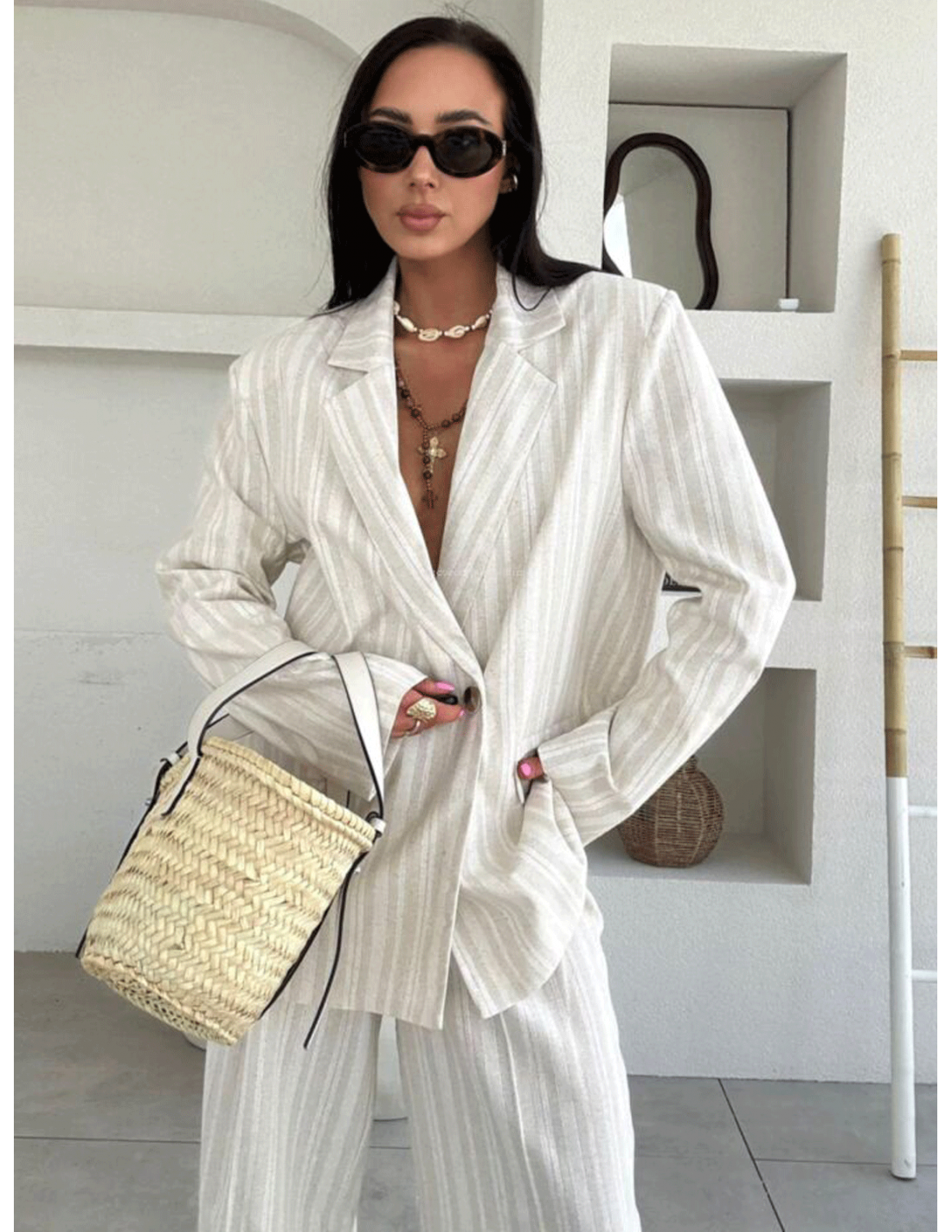 Długa lniana marynarka w pasy CAROLE - beżowa