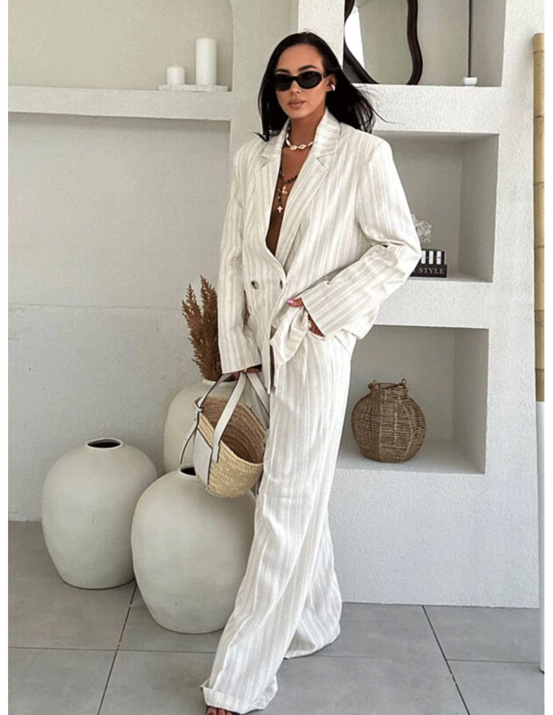 Dodaj swojej letniej garderobie szyku i klasy z lnianą marynarką w paski CAROLE – idealnym wyborem dla kobiet ceniących styl i komfort!