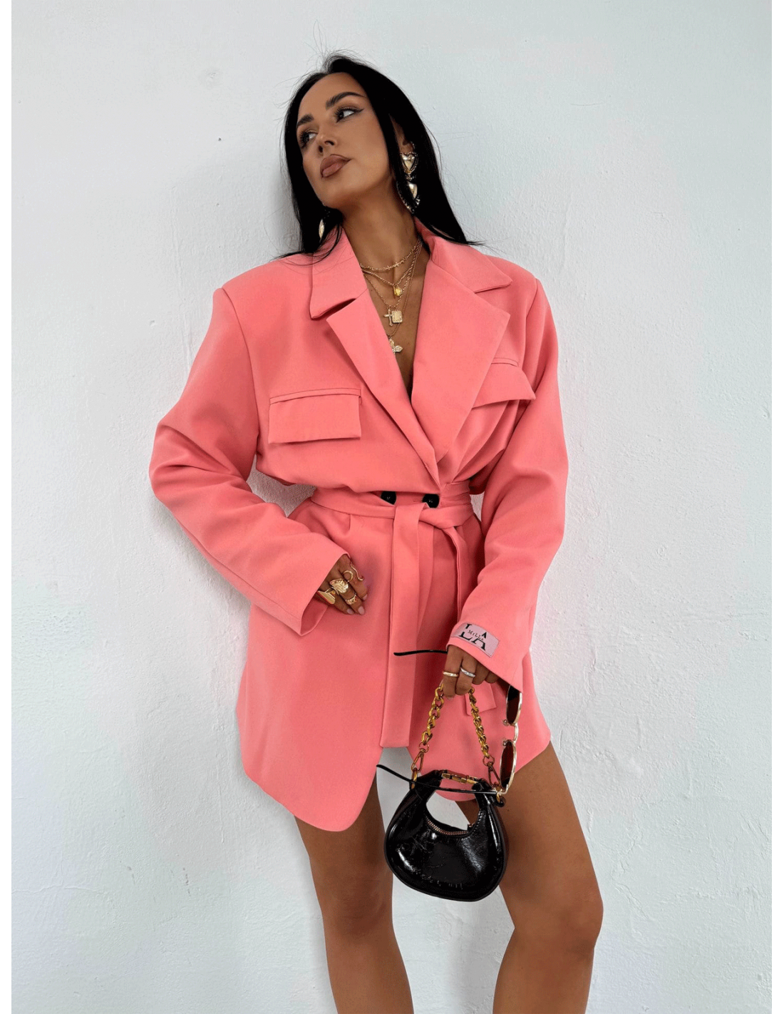 Ta długa, oversize’owa marynarka to absolutny must-have dla kobiet, które kochają połączenie klasy i nowoczesnego charakteru.
