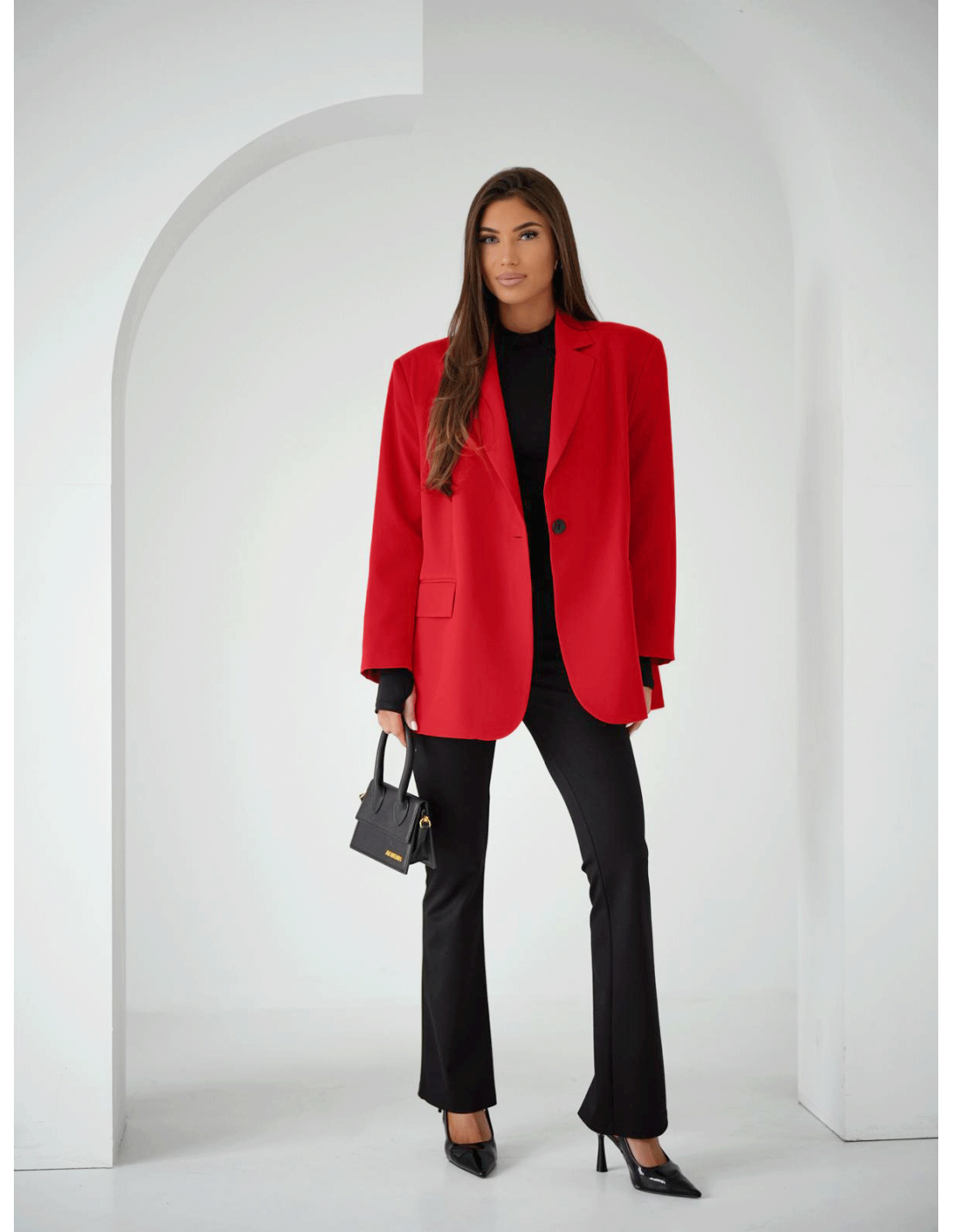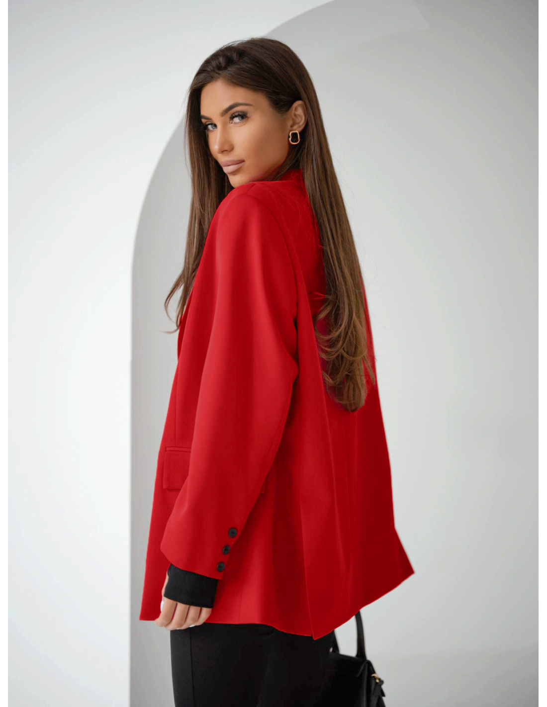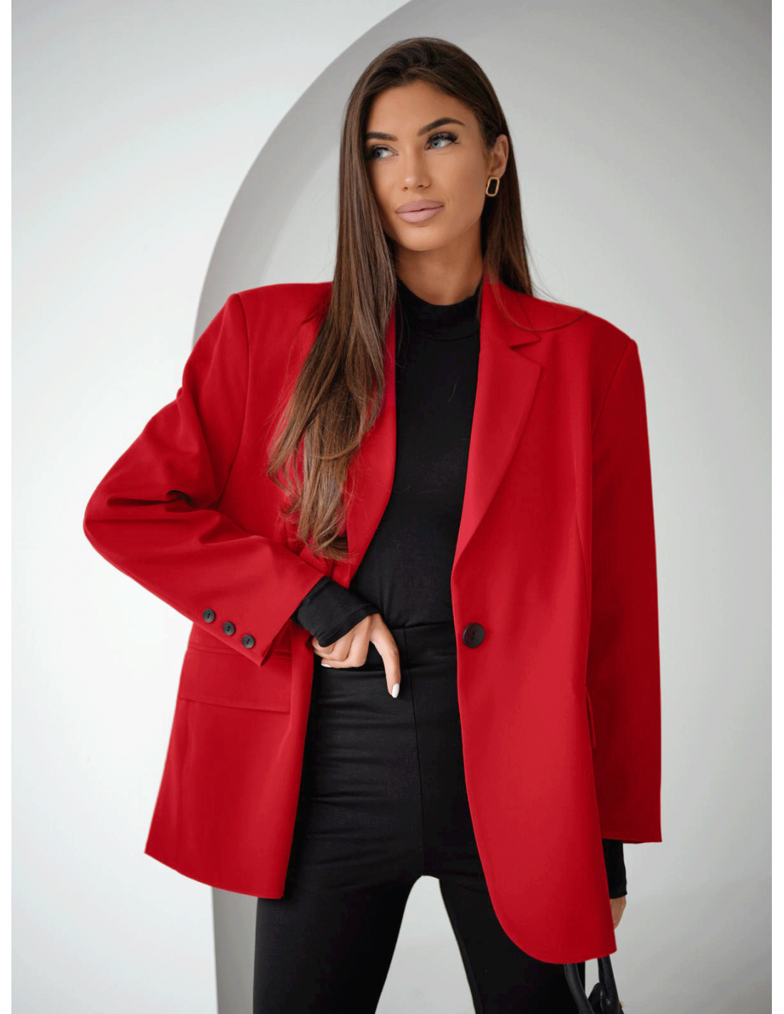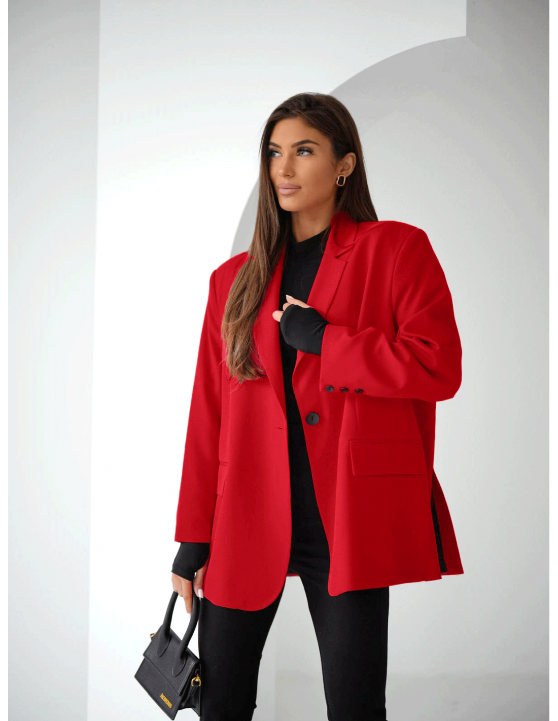 Podkreśl swoją stylizację długą, oversizową marynarką DIONISIA w wyrazistej czerwieni.