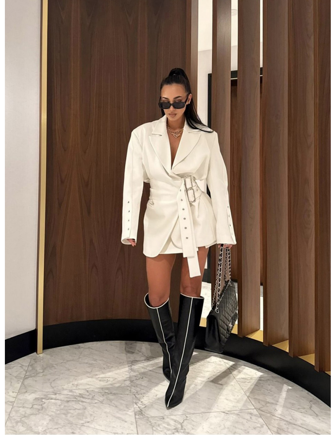 Noś ją solo jako sukienkę z kozakami za kolano lub zestaw z dopasowanymi szortami, szpilkami i minimalistyczną torebką, tworząc look pełen klasy i wyrazistości.