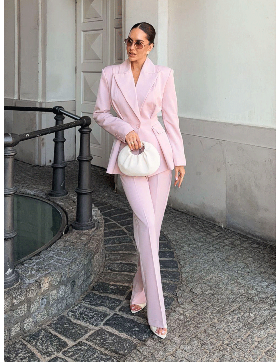 Marynarkę w kolorze brudnego różu noś w komplecie z dopasowanymi szortami i szpilkami na większe wyjście