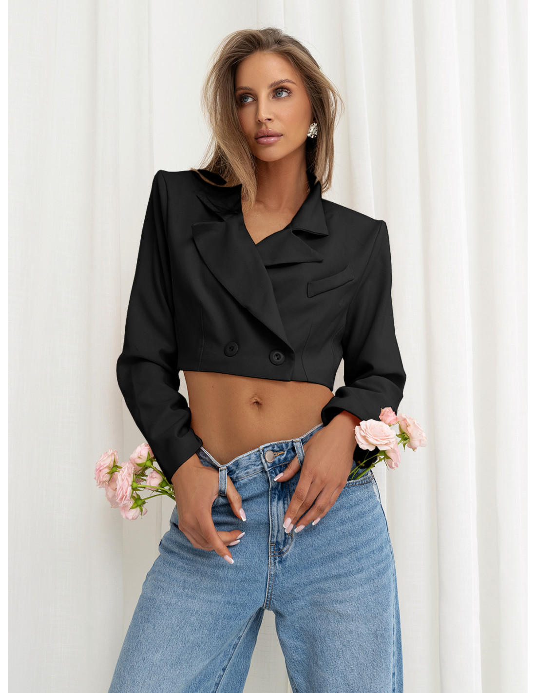 Ta krótka marynarka to wyjątkowo stylowy element garderoby, który doskonale podkreśla kobiecą sylwetkę i nadaje stylizacji nowoczesnego charakteru.